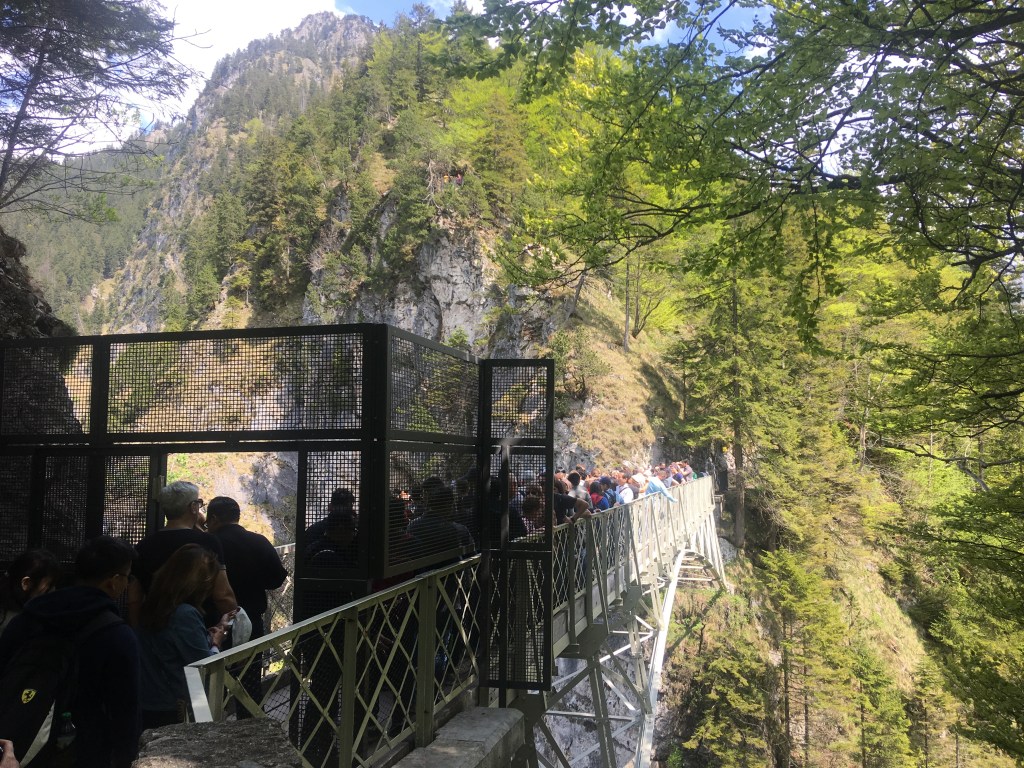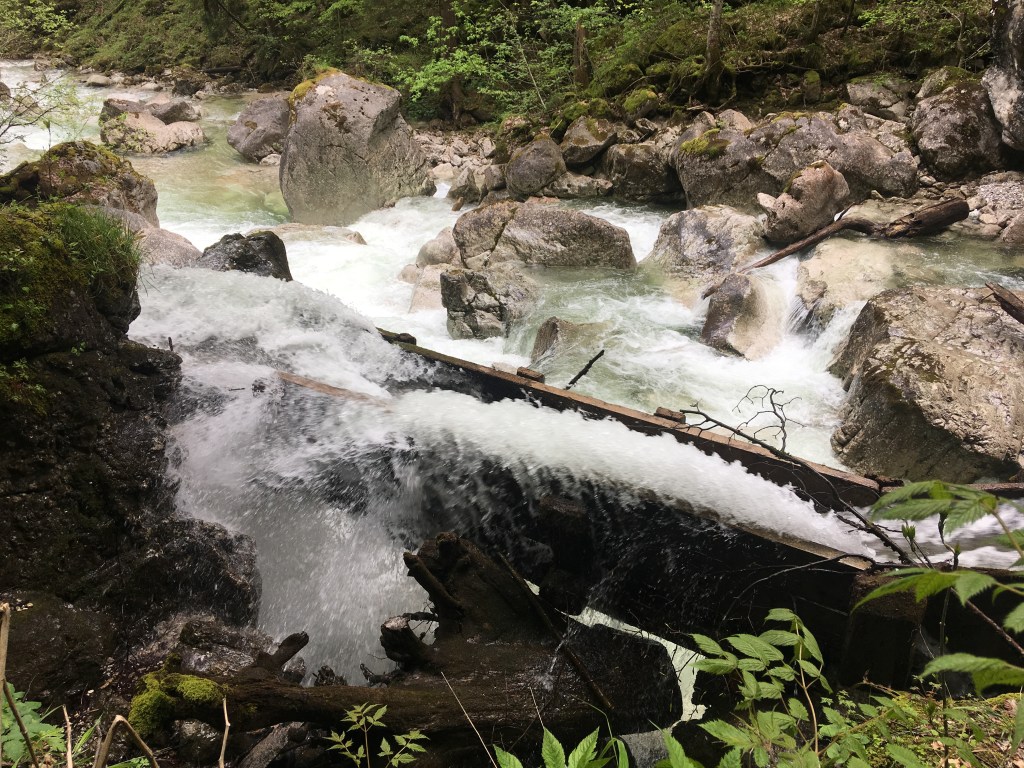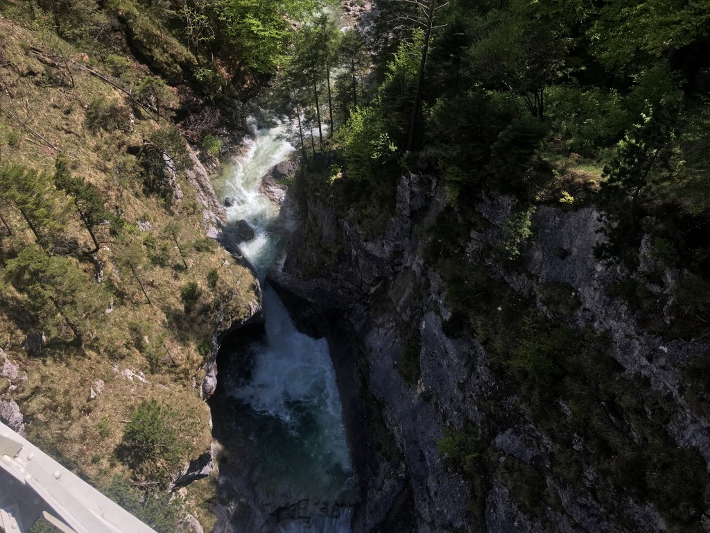 Further on, the track downhill narrows and is replaced by a series of steel bridges that hug the side of the Gorge. I’ve read that this was only opened last year: it used to be a much more rickety boardwalk that had to be closed because it was in danger of collapsing and taking a good chunk of Bavaria’s tourism along with it. I can still see the rusting foundations through the mesh, their jagged metal teeth threatening to slice open anyone’s leg should the steel beneath our feet suddenly give way. Beneath that the River Pollat gushes on, foaming and flowing everywhere, absolutely refusing any attempt at being tamed. This last bit I gather from a bend in the river, where some wag has diverted part — PART — of the river into a wooden trough that goes on for about ten feet, rounds a corner, and then empties straight back into the river. Much of it simply ignores this last development and spills straight onto our pathway.