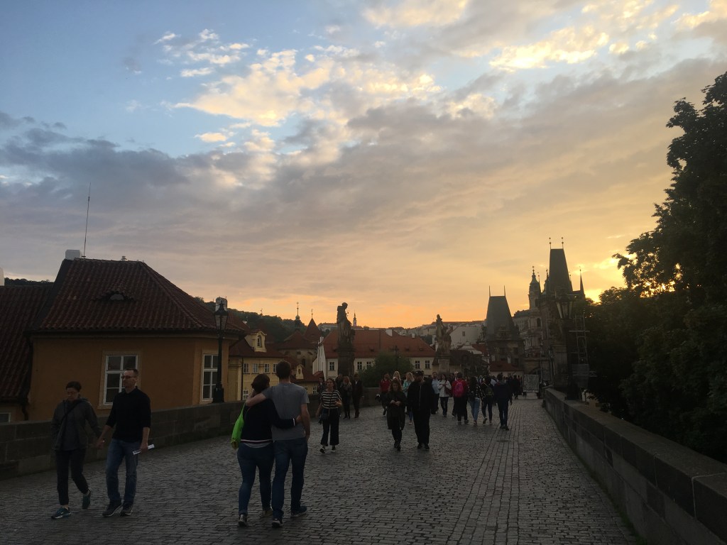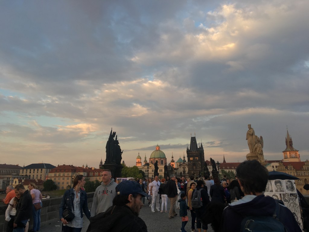 It just feels so unreal here. Even at half past eight in the evening, the Bridge is bustling with tourists, shouting at each other in a hundred different languages. Yet instead of hearing a hundred voices, it’s just one: they’ve blended into one another, each cancelling the other out. There’s room to walk (God forbid the day when you can’t see ahead of you in Prague) but all the faces I can see here just seem the same: foreign, joyful, hungry for more. Meanwhile, the buildings on the opposite bank are beautiful to look at — and yet, all those decorative facades glowing in the twilight feel like they’re a world away, shimmering mirages in a haze of decadence. The ground feels light as I skip along the Bridge, my steps feel like they’ll float off the Earth any second. I’ve forgotten everything else but the fact that I’m now on the most famous bridge in Central Europe. And I’ve never felt more like I’m in a dream.