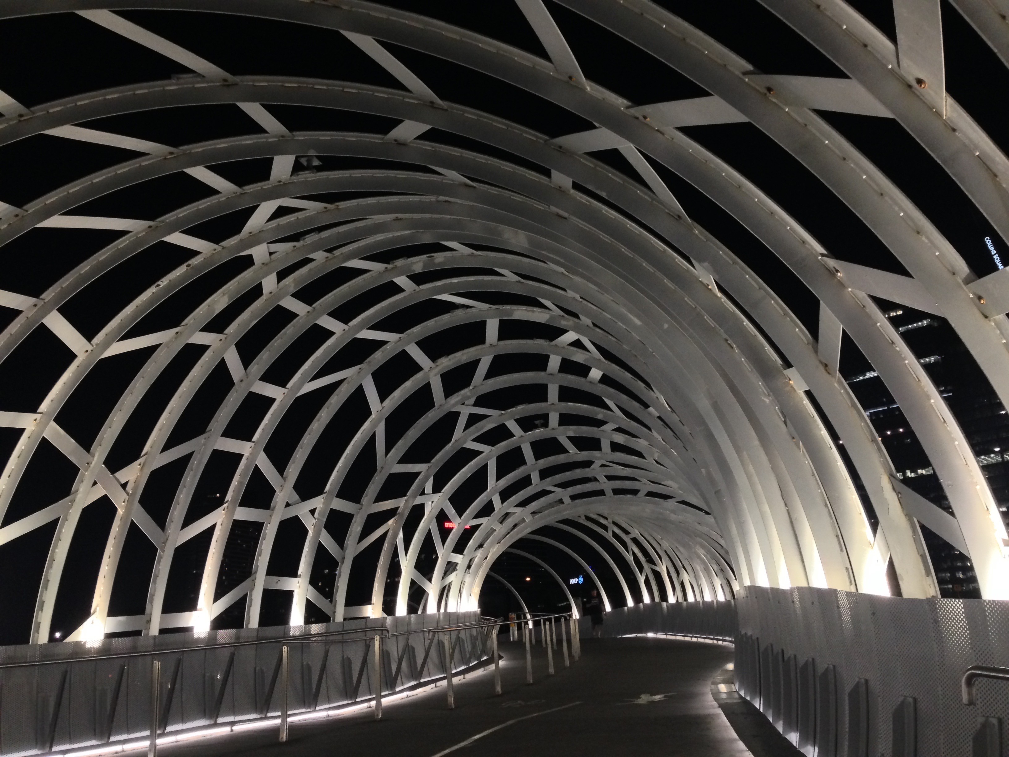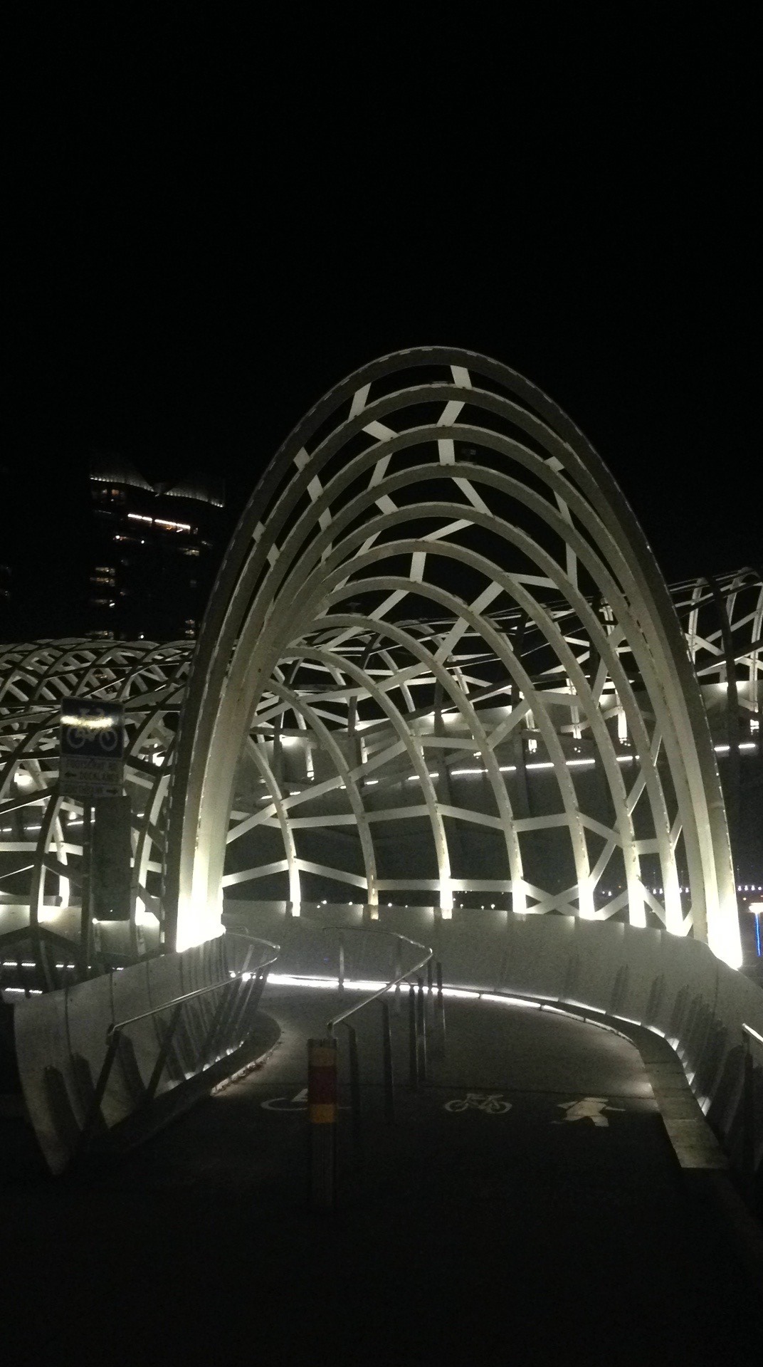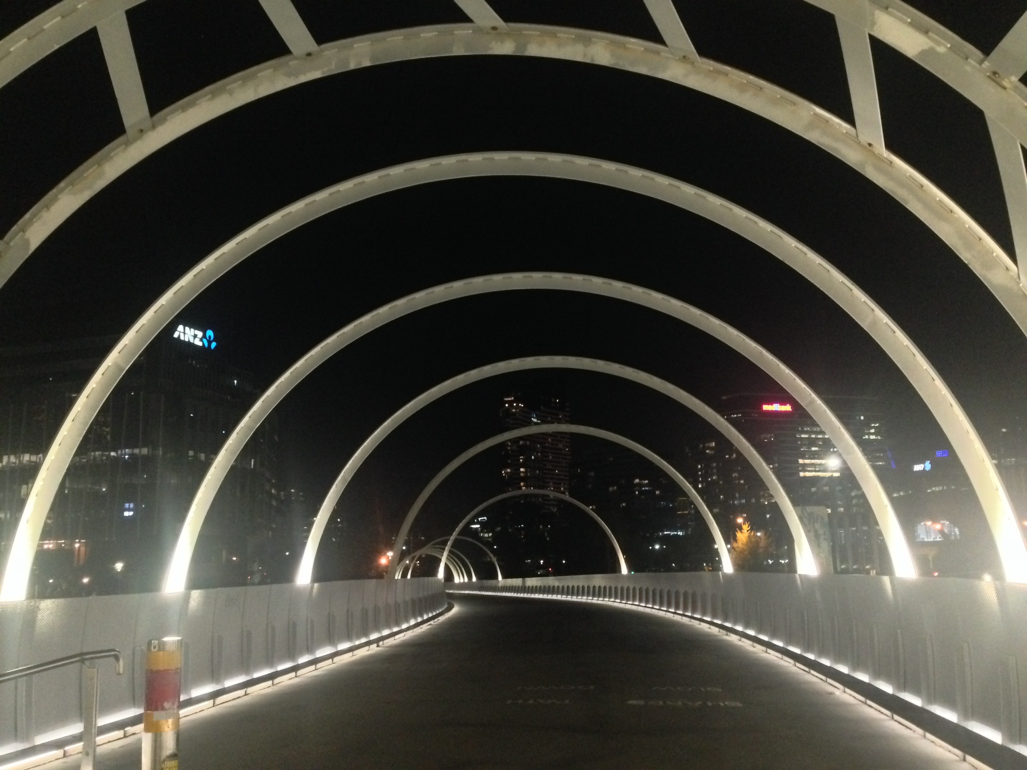 This perfect piece of architecture is the Webb Bridge. It’s one of Melbourne’s newer crossings, though its heritage dates back to the 19th century when freight trains from Southern Cross used it to cross the Yarra and reach the docks next door. When that closed, the city redesigned this into what is simply the best pedestrian bridge in the world. The connecting ramp looks like the skeleton of a whale, all uneven and bleached, a stark contrast against the pitch-black sky. There are bits sticking out, bits sticking to each other across the framework, and it curves unnaturally in a wide loop away from itself before striding across the river — in other words, it’s a beautiful salute to weirdness and making do in architecture. I know I’ve just gushed over the Sydney Harbour Bridge, but this is better. Infinite times better. In fact, I’ll just go ahead and say that this place, the Webb Bridge, IS my favourite place on Earth. You may very well protest. But wait till you’ve tried this place on a pitch-black night.