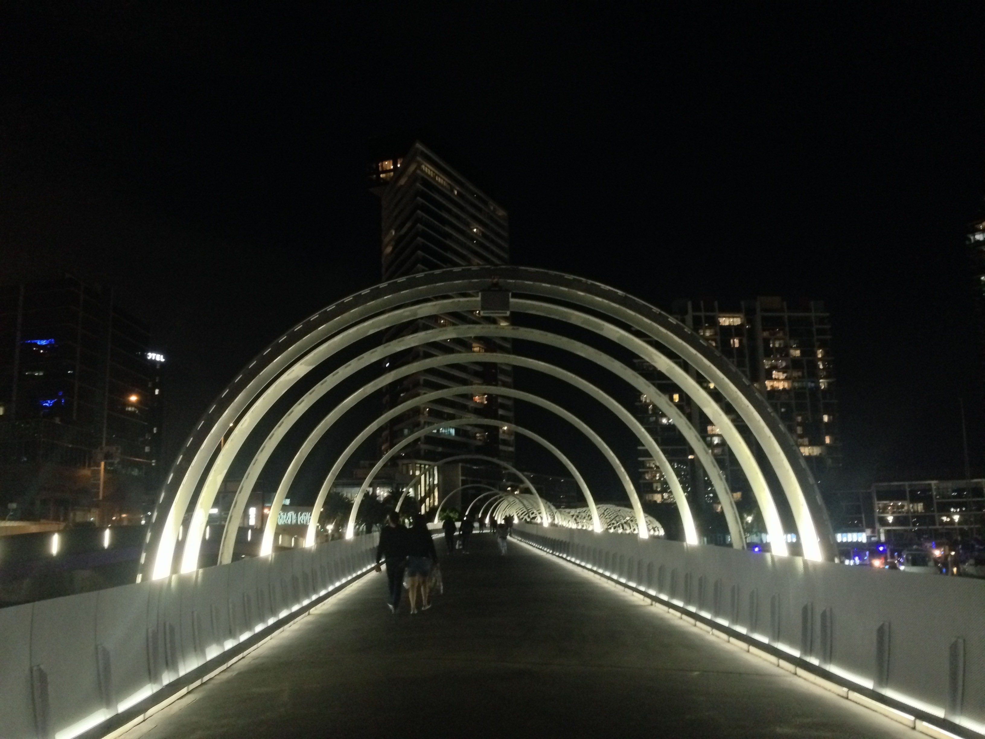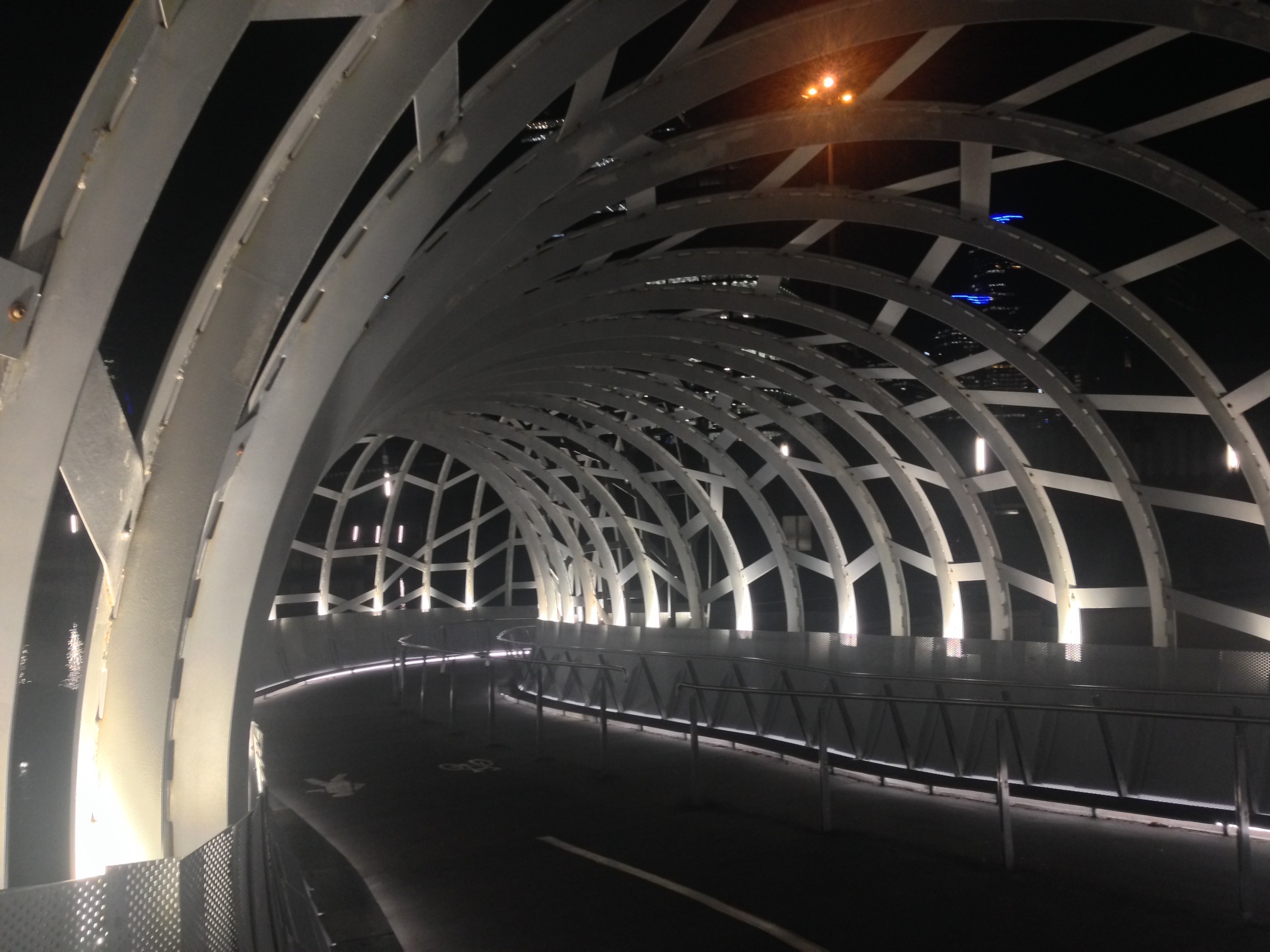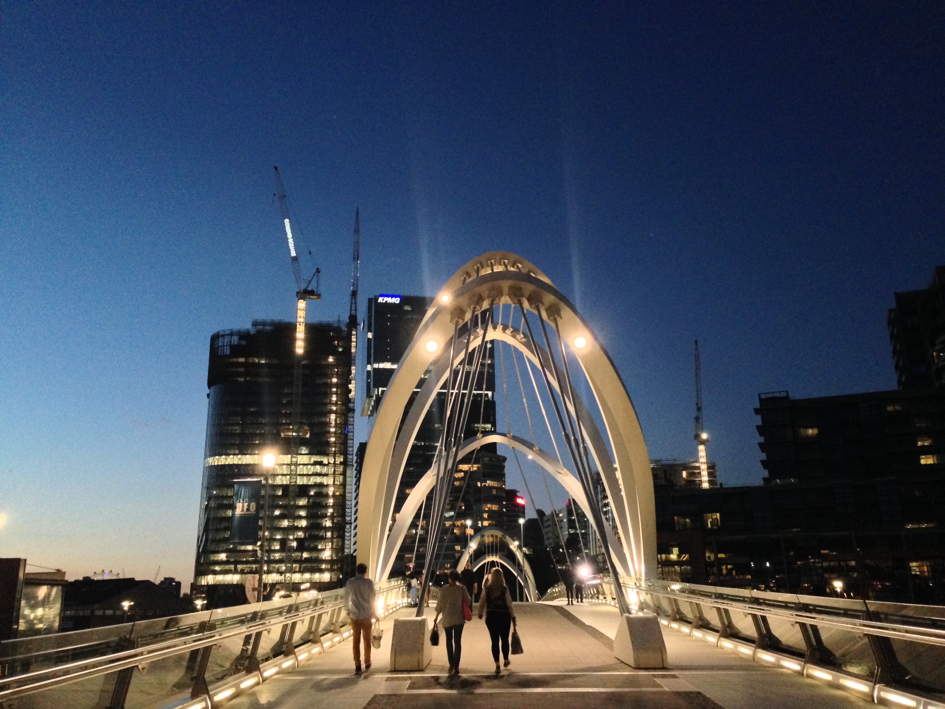 Half an hour later, we’re trekking down the Yarra, on a whistle-stop tour of the bridges spanning the river right down from Federation Square. First up is the Sandridge Bridge, until twenty years ago the bridge that carried trains over the river and all the way down to St Kilda and Port Melbourne (both seaside, both two of my favourite places in Melbs). A celebration’s happening at the foot of its south side: a magic show, filled with banter and sleights-of-hand that due to the height of Australians we don’t really get to see. Stride past the Casino and head past Seafarer’s Bridge, easily one of the more impressive ones that cross the Yarra, then there’s a short stop at South Wharf for a toilet break. (Walking, as it turns out, has intimate ties with that part of the body.)