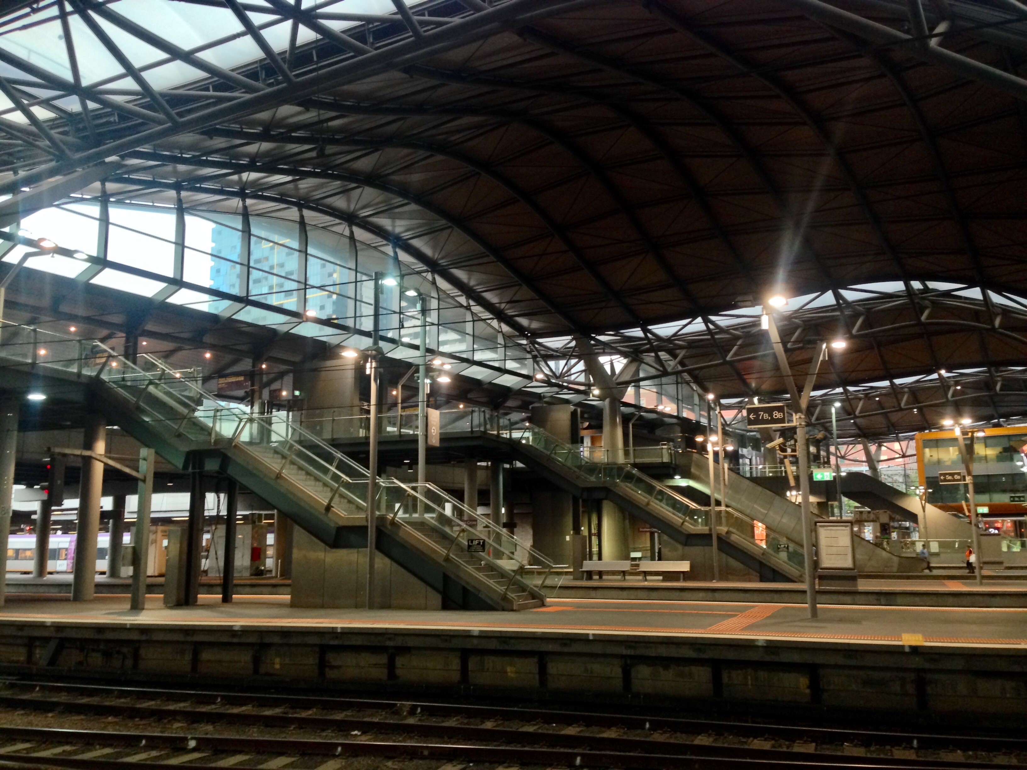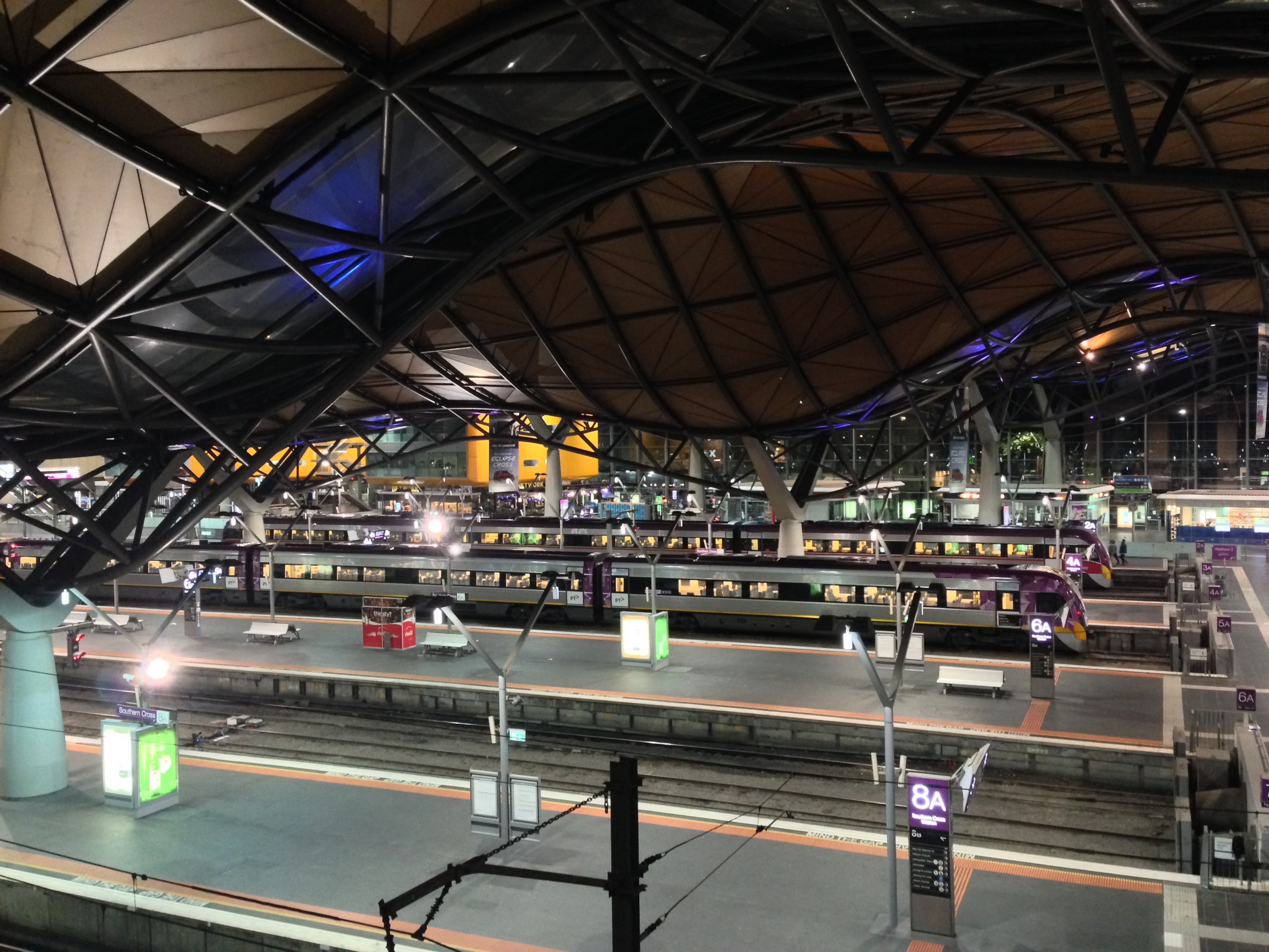 Sitting on the platform waiting for the train to arrive, I look up and marvel for the thousandth time at the wonder that is Southern Cross station. Unless you are reading this in the 2030s (in which case wow, WordPress still exists), this is the first railway station you see when you arrive at Melbourne, and the good thing about that is that your love affair with Melbourne gets off to a VERY strong start. As you might expect from a station named after a constellation, everything here evokes the stars: the canopy is far above the station, so dark that it might well be the night sky; the dotted lights are blue and yellow; and so on. Just typical of the Australians to give you something to look at while you wait.