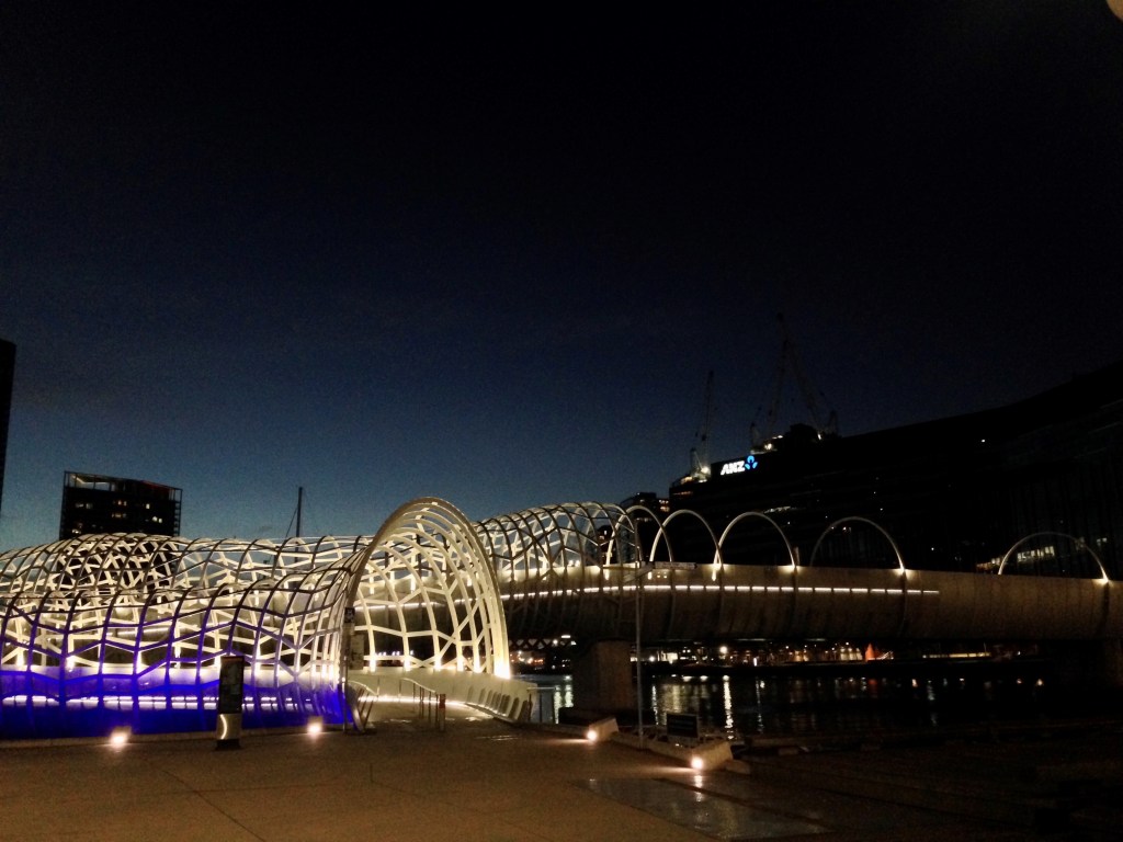 Over servings of lamb chops, we get talking about our experiences of Melbourne. Valerie’s still only one-eighth into a four-year residency here, while the rest of us only have a few more weeks to live (in Melbourne). Where’ve we all been then? Puffing Billy, the Shrine of Remembrance, Brighton Beach… I casually bring up the Docklands — “I know it’s probably one of the first things you visit, but have you been there at night?”