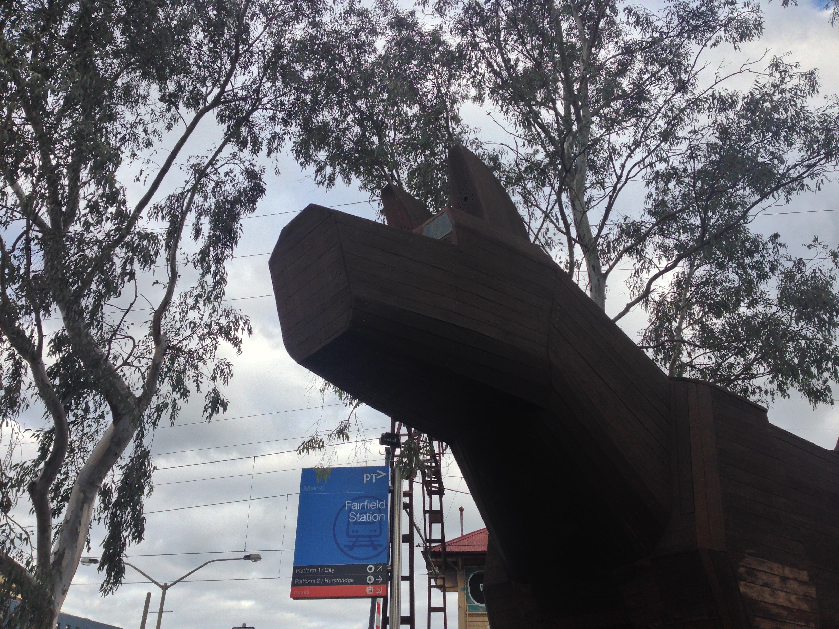 While I wait for them in the station carpark, I take a long, hard look at a dog that towers into the sky over Fairfield station. No, it’s not a scientific experiment gone wrong: this is “FIDO” (short for “Fairfield Industrial Dog Object”), a wooden sculpture that has stood guard here for almost two decades. Although the council insists that FIDO is an interactive sculpture and can be activated “in fascinating and unpredictable ways”, the only thing that fascinates me about it is how the hell they persuaded the good people of Fairfield to splash fifty THOUSAND dollars on this log. It’s amusing, yes, but surely a $50,000-dog can do something else than just stand there?