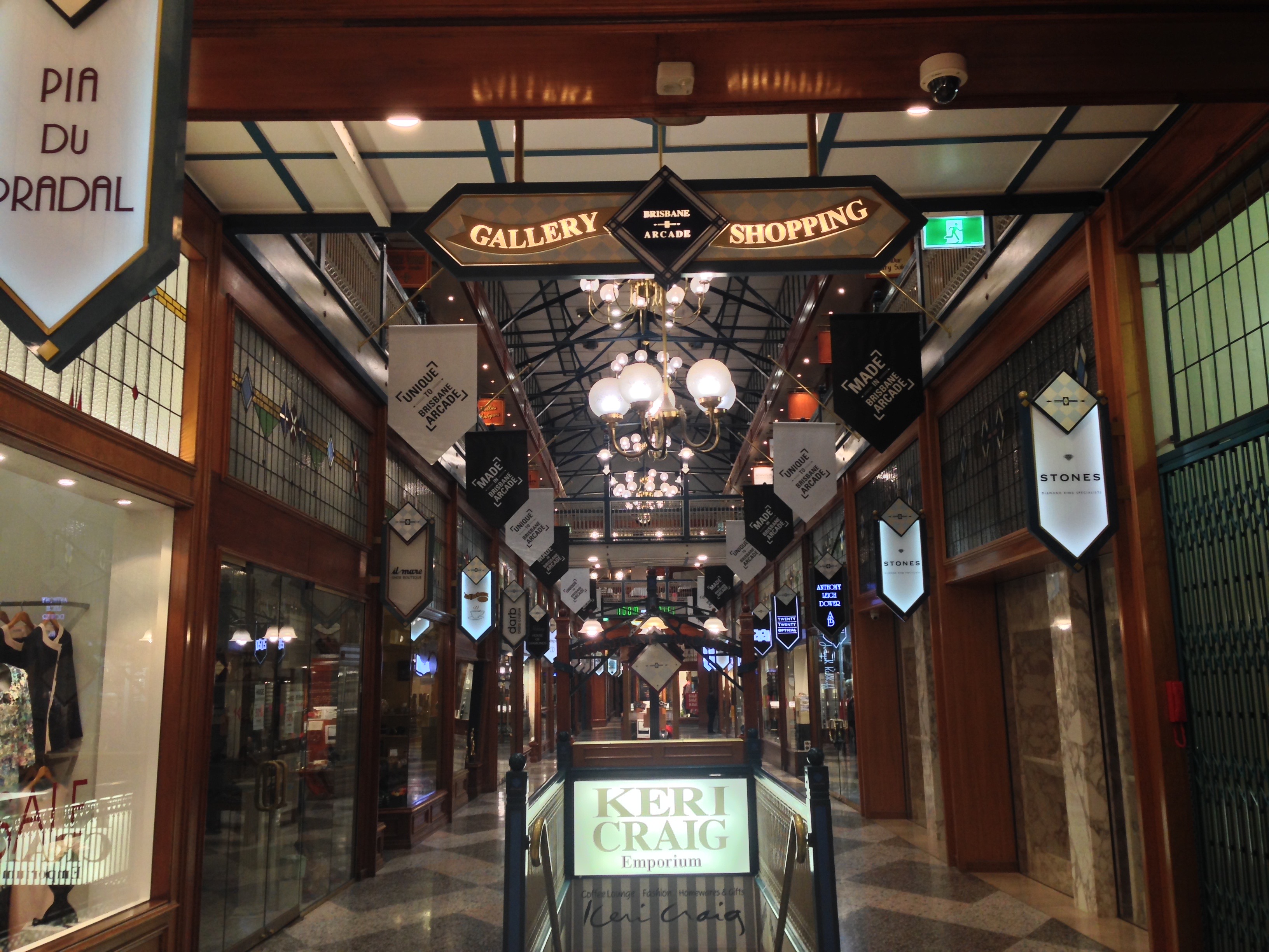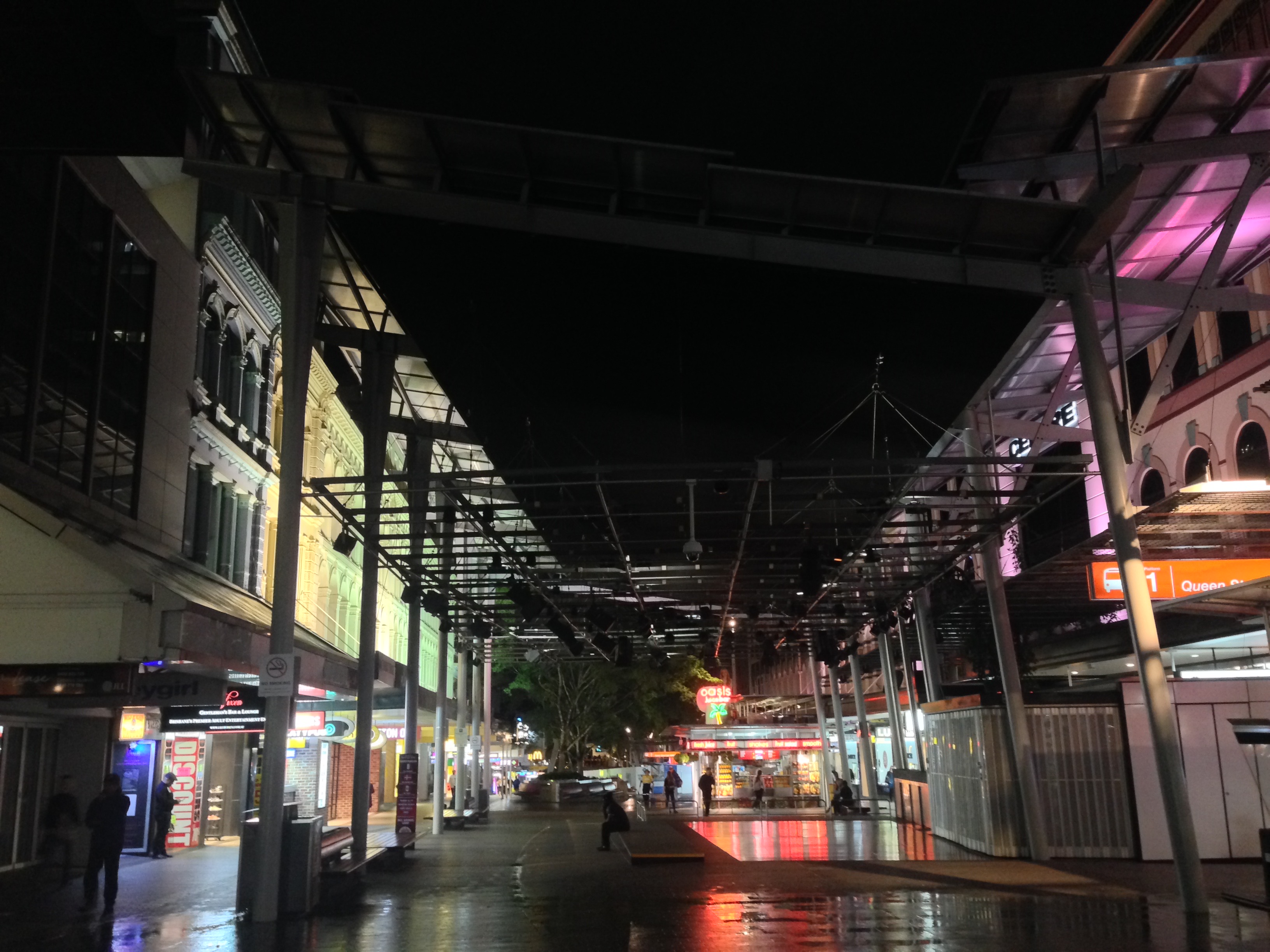 Then onto the Queen Street Mall, the heart of consumerism in Queensland. This is where the magic is supposed to happen: bright lights, architecture that relies much more on iron and glass than brick and mortar. Even on a Wednesday evening, in the middle of the week, this place is bustling with tourists and youngsters alike: everyone around me is laughing or staring at wonder at the colourful shops and darkened facades that come from all walks of history. There’s even a bit of Melbourne or Adelaide in this place: round the corner I find the historic Brisbane Arcade, a slim passageway exquisitely designed with shiny tiled floors and exposed pediments and balconies where you can see everything. Most of the shops are shut and everything is quiet, but it’s still drawing people to walk and stare.
