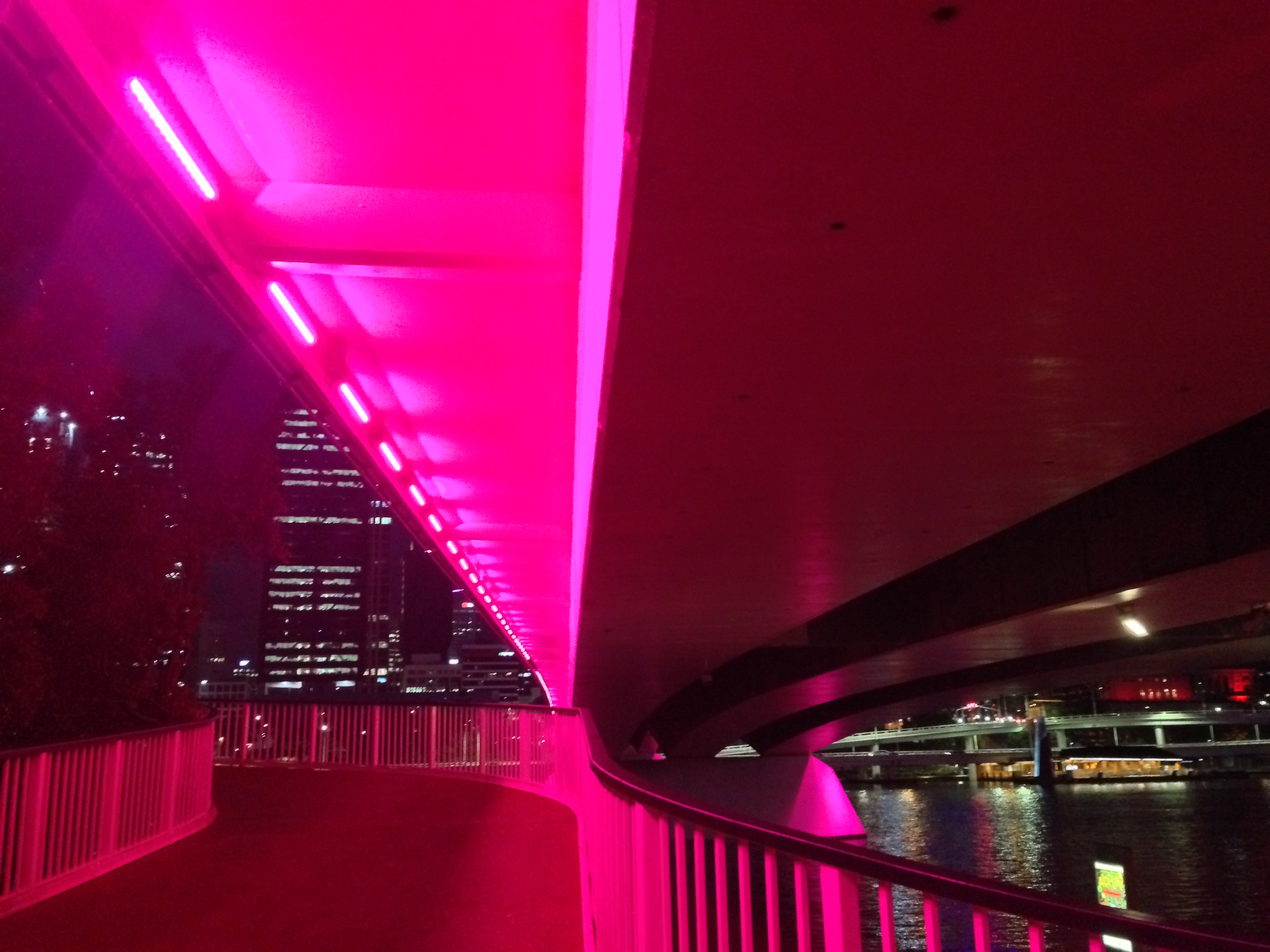 One last attempt to liven up the day. While walking through Southbank earlier, I came across their Riverwalk, a fancy name for a pedestrian-and-cycling path that they’ve built right next to the river far below. (Only when you’re on the bridges walking across to the other side do you realize just how hilly Brisbane is: there seems to be a huge drop down between the river and anything more than twenty feet away from the banks.) A walk on the river always helps to calm the nerves: granted, I’m not expecting much from the slowly-flowing, almost stagnant water of the Brisbane River, but surely it should at least prove more poetic than grimy, almost empty city streets? In the dark, however, it is immensely hard to find a way down to the Riverside. Every road I find leading down to the river seems to end with a HUGE highway overpass, a honking great concrete hydra that seems determined to stop any casual walker from walking down to the river.