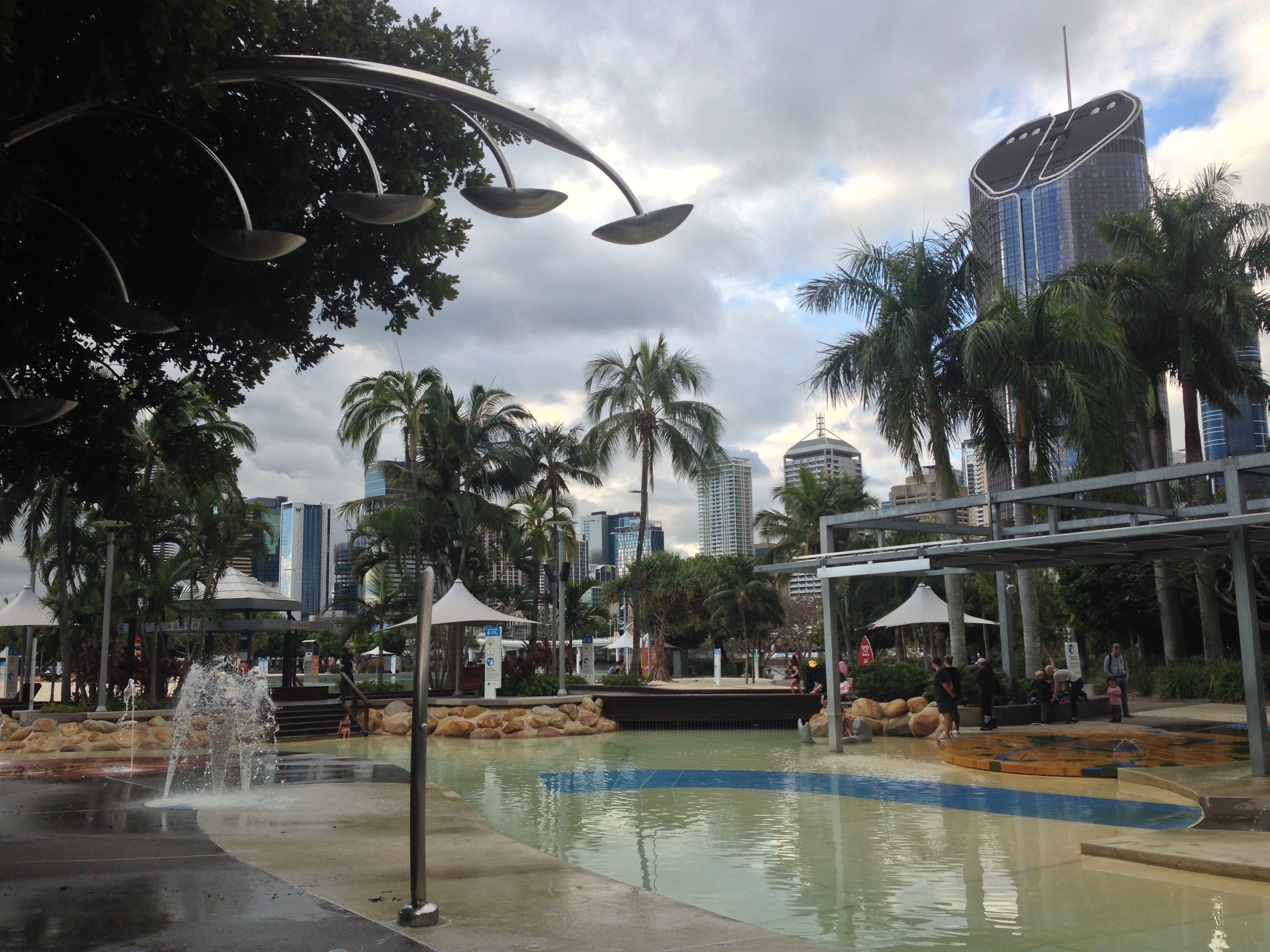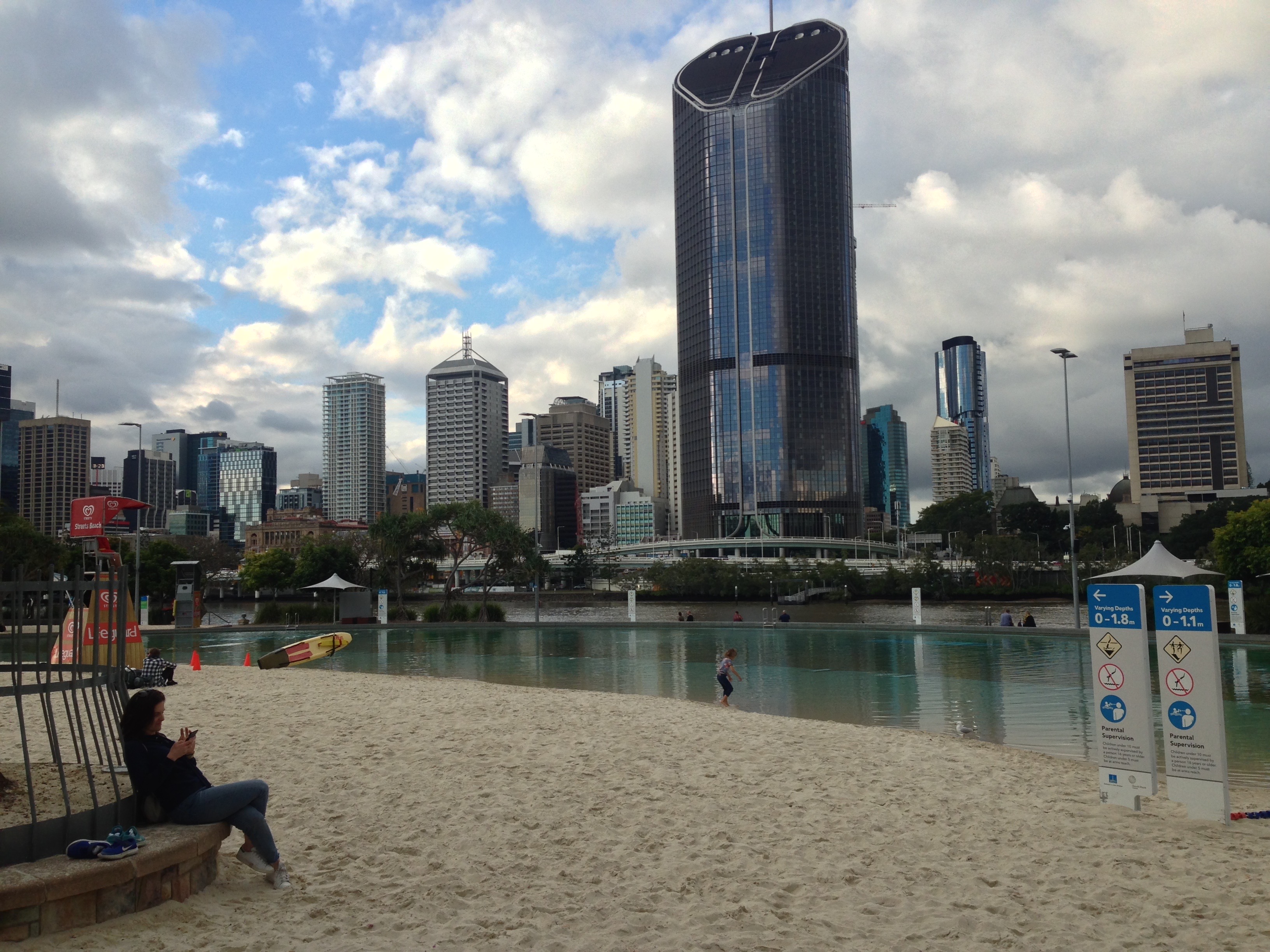 Half past four finds me strolling along the banks of the Brisbane and past a Ferris wheel (was that even here yesterday?) to the South Bank Parklands. Formerly the site of Brisbane’s 1988 World Expo, they had a honking great piece of vacant land lying around after everyone had gone home. Instead of using it to build houses or showing the pavilions off as monuments to posterity (or is it stupidity?), they’ve built a nice park on the site. And a beach. On the river.