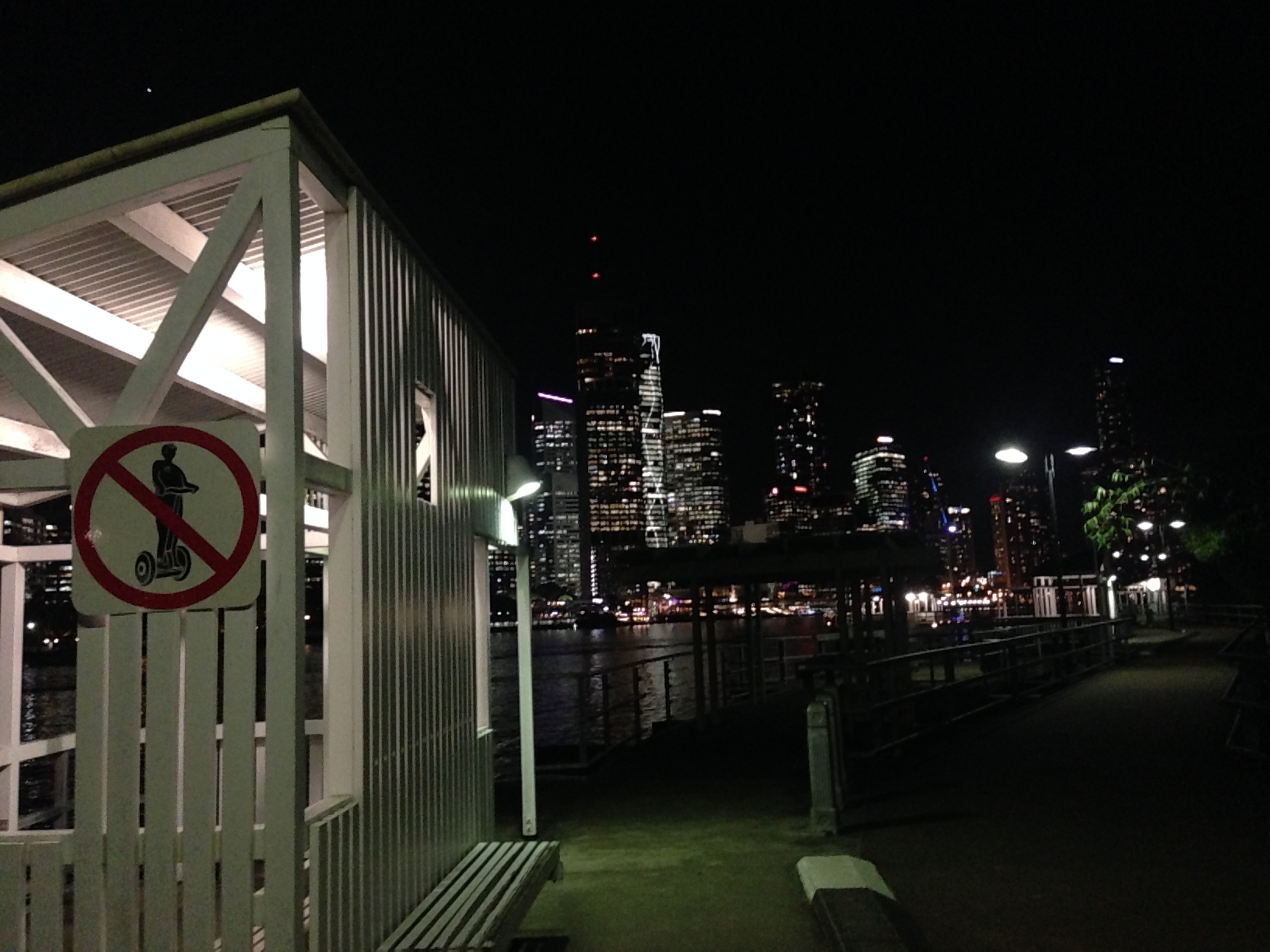 To my right, the cliffs of Kangaroo Point shoot up into the skies, lit by spotlights of white and purple. I’ve read that you can actually climb up the cliffs during the day, and indeed as my eyes adjust to the gloom I can spot people hoisting themselves up the rockfaces, like the Dutch do with their furniture. It’s not just the odd enthusiast too — there are at least seven or eight lines of climbers, all grunting with the effort, their shadows flickering and morphing on the rocks in front. People run to and fro, figuring out which route to take, checking out their equipment — it’s an astonishingly pretty sight, mysterious and romantic all at once. Why do these people risk their lives to do all this in the dark? What can they be plotting? Have I chanced upon some secret mission? That shadow running right in front of the purple haze of the spotlight, maybe that has a story to tell… maybe it’s time I had a bit of a lie down… to my left, Brisbane glows in the dark, a bustling city of people and pinpricks of light.