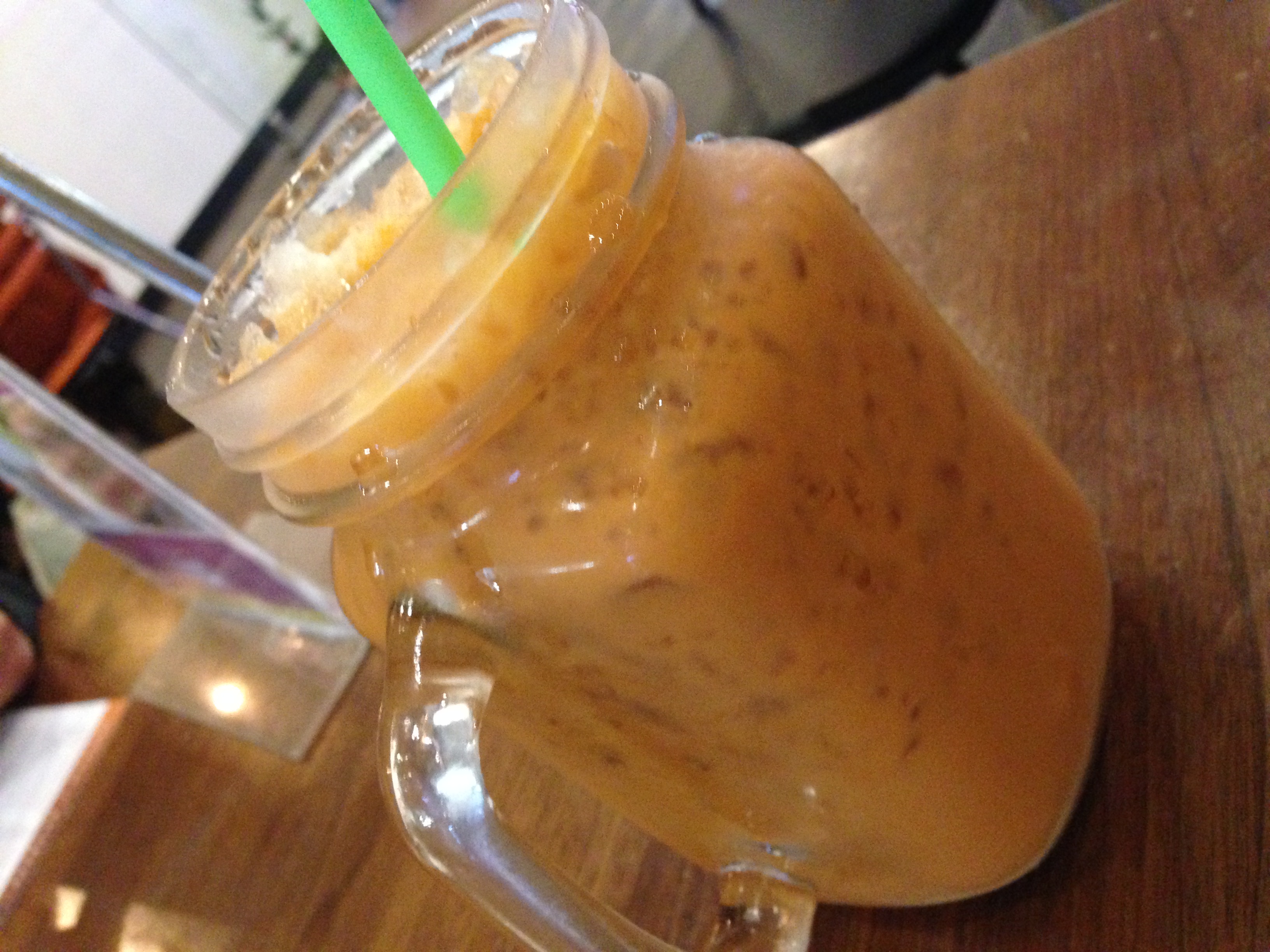 Meet up again with Betsy in Brisbane’s Chinatown, a brightly lit pedestrianized road that’s somehow already desolate at half past seven, and enter a Thai restaurant. In the grand tradition of interchangeable Asian expertise, the waitress, an elderly matron who seems to deliver a deafening riposte to the kitchen every twenty seconds, speaks fluent Cantonese (or rather, barks fluent Cantonese at us). I’ve completely forgotten about the food — the thing about Asian food, for me run-of-the-mill and easily available, is that so much of it passes through my mind and straight into oblivion — but I do remember the treacly Thai milk tea that they served. I can still see the streaks of white that the milk is forming in the tea, and a small sip is enough to cause tooth decay a hundred times over — but I’ll be damned if it isn’t a forking good drink.