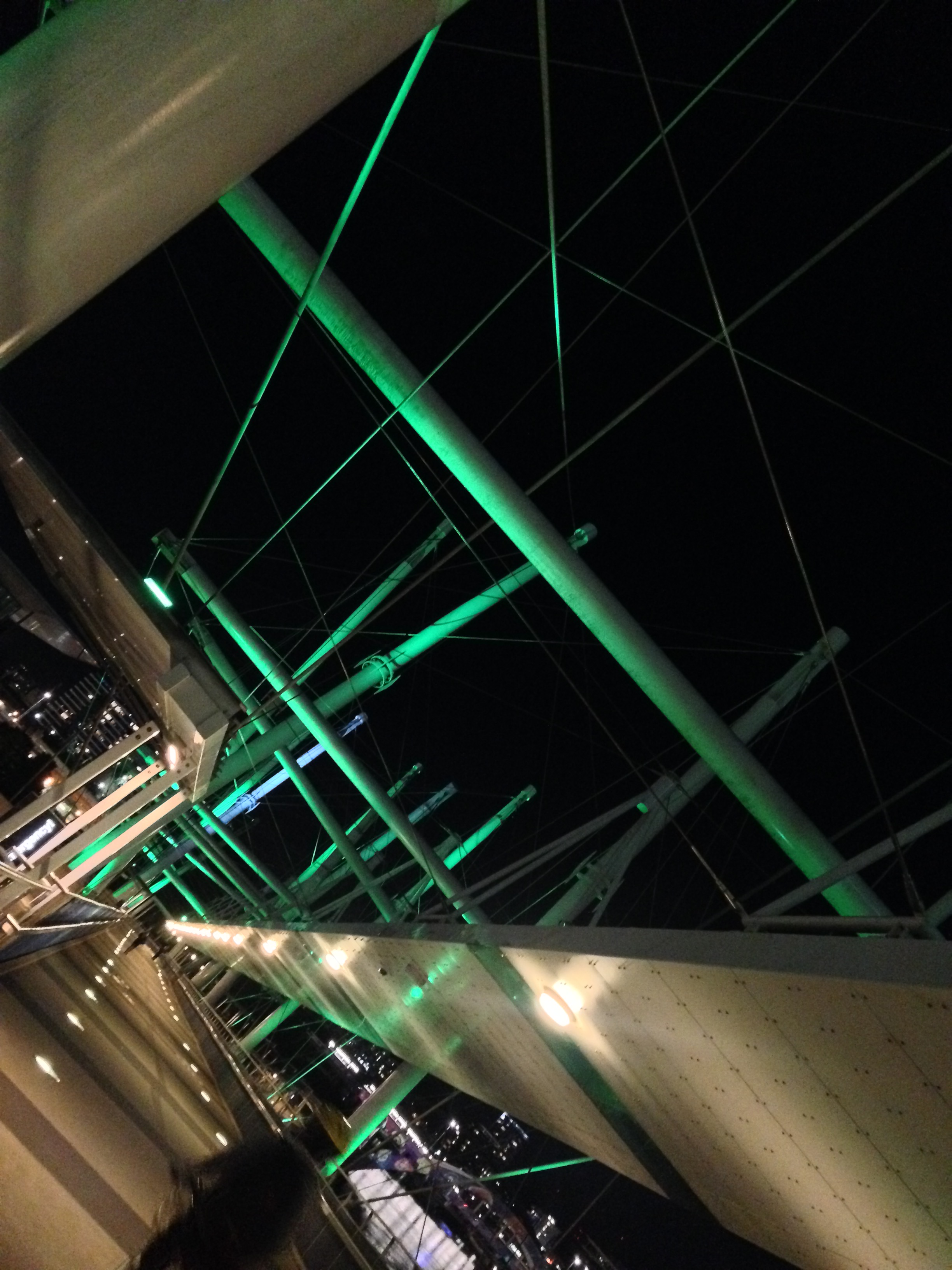 And just like the Sydney Harbour Bridge, I absolutely love the place. Besides the white lights that make the bridge brighter than the Sun on Judgment Day, they’ve also placed at regular intervals coloured lights along the Bridge, and I watch as they weakly glow pink and red and blue, a valiant and if I’m honest rather touching attempt to provide the bridge with a bit of colour. But what really does it for me is the framework. Have you seen gone through the iron skeleton of a bridge at night? If you haven’t, you’re missing out on a lot: you can see the girth of the bridge beams around you, you can see them reaching into the sky. But what you can’t see is how they connect, how they intertwine with each other to hold up the entire structure. You can only guess at the mystery of what goes on in the heavens above: how far above us does it reach? The fuzziness of the top of the bridge is a romantic enigma of girth: its aura of mystery is precisely what makes it so very powerful, and call me a sucker for unfathomable things (and bridges), but it’s the sort of place where you fall in love with architecture once again.