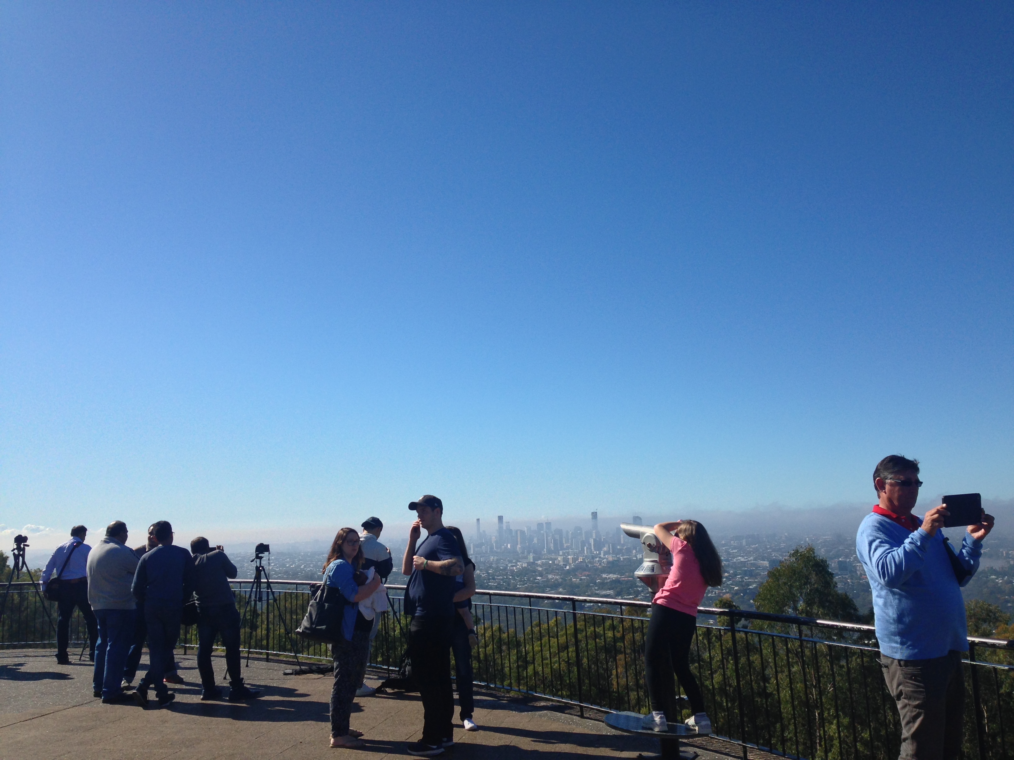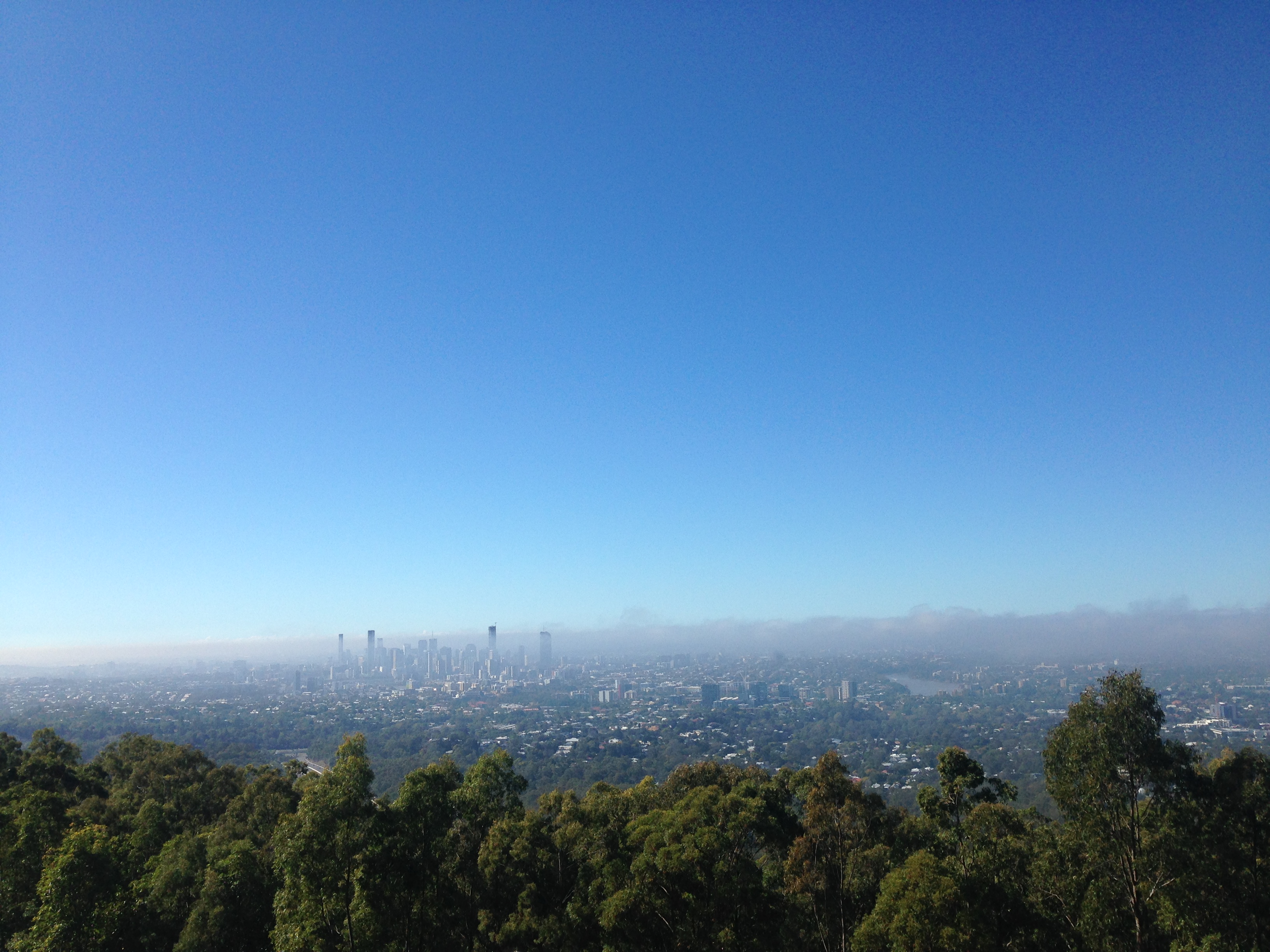 The bus twists and turns as it winds its way through the suburbs, and begins to climb uphill. As we get further and further out of Brisbane Centre, the streets start getting insanely narrow — there’s barely enough room for a small sedan coming the other way, and I can almost see through the front windows of houses. I begin to worry that the driver has lost his way and that we’re just running through random narrow streets in a desperate attempt to find a path to the top, but apparently he does know where it’s going because we soon find ourselves at the Brisbane Planetarium, halfway up the hill — some of the people get off, but most people (like me) stay on the bus, waiting to get to the very top. We continue to wind, the trees getting thinner and thinner as we ascend to new heights of the seemingly unending mountain. The higher we go, the more evidence there is of sightseers: cars parked on the sides of the road, a café or two scattered across the road ahead. Then with a flourish the trees vanish, we make a left turn, and then suddenly we’re on top of the world.