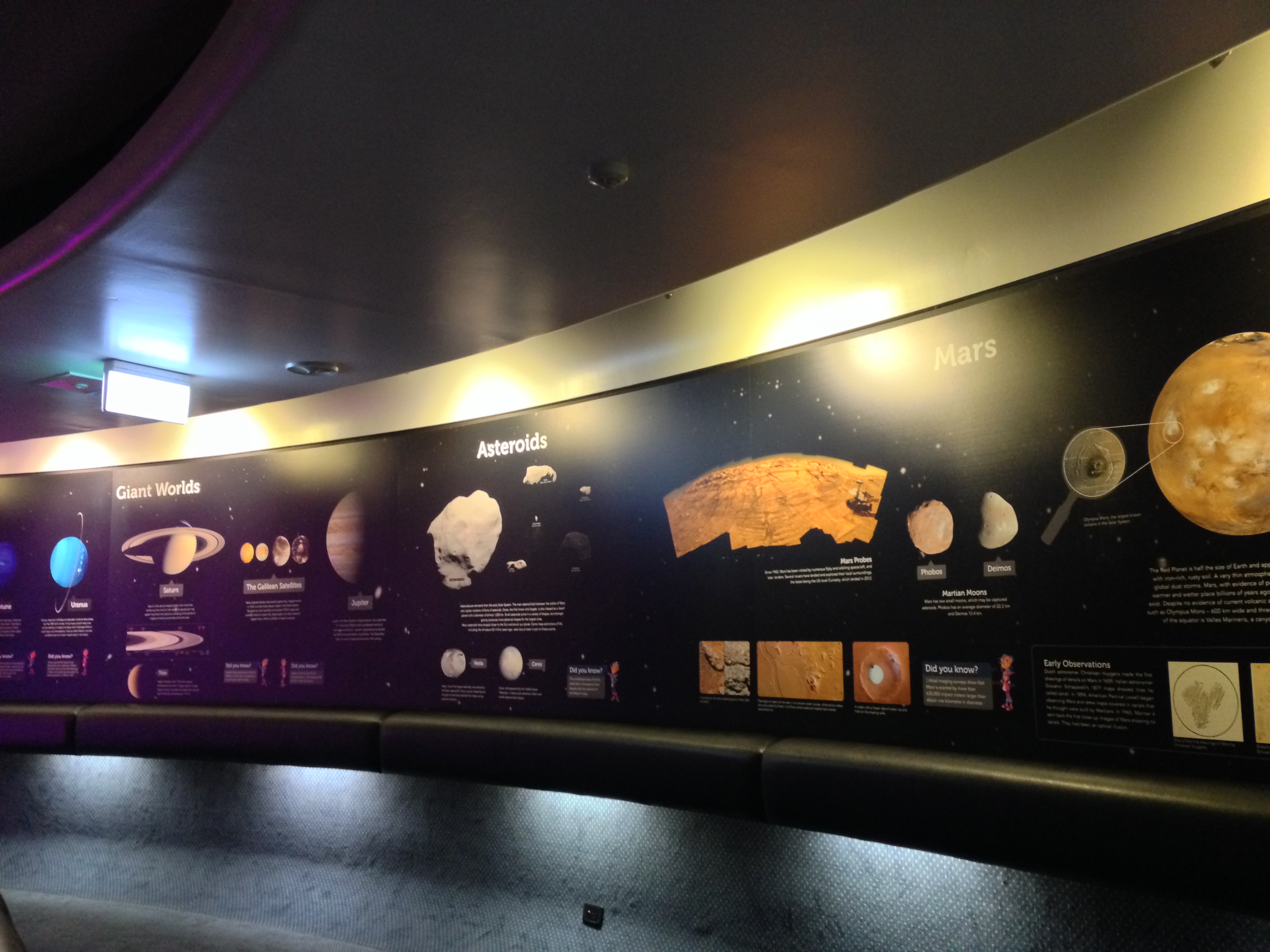On my way out, I catch a glimpse of an armillary sphere, the sort which you might see in the Game of Thrones titles, and the one you see upstairs. Instead of deer and wolves fighting and stabbing each other, however, this one simply has the constellations drawn on its leather surfaces. I’ve always found mediaeval conceptions of the sky to be somewhat romantic, and although this one can’t possibly be more than a couple of hundred years old, it’s convincing enough that you can imagine it to be the real thinge. This might not be a satisfactory planetarium — there isn’t even a painted ceiling — but the astrolabe adds a splash of colour to what is otherwise a pretty dull place, and honestly, that’s the best you can hope for these days.