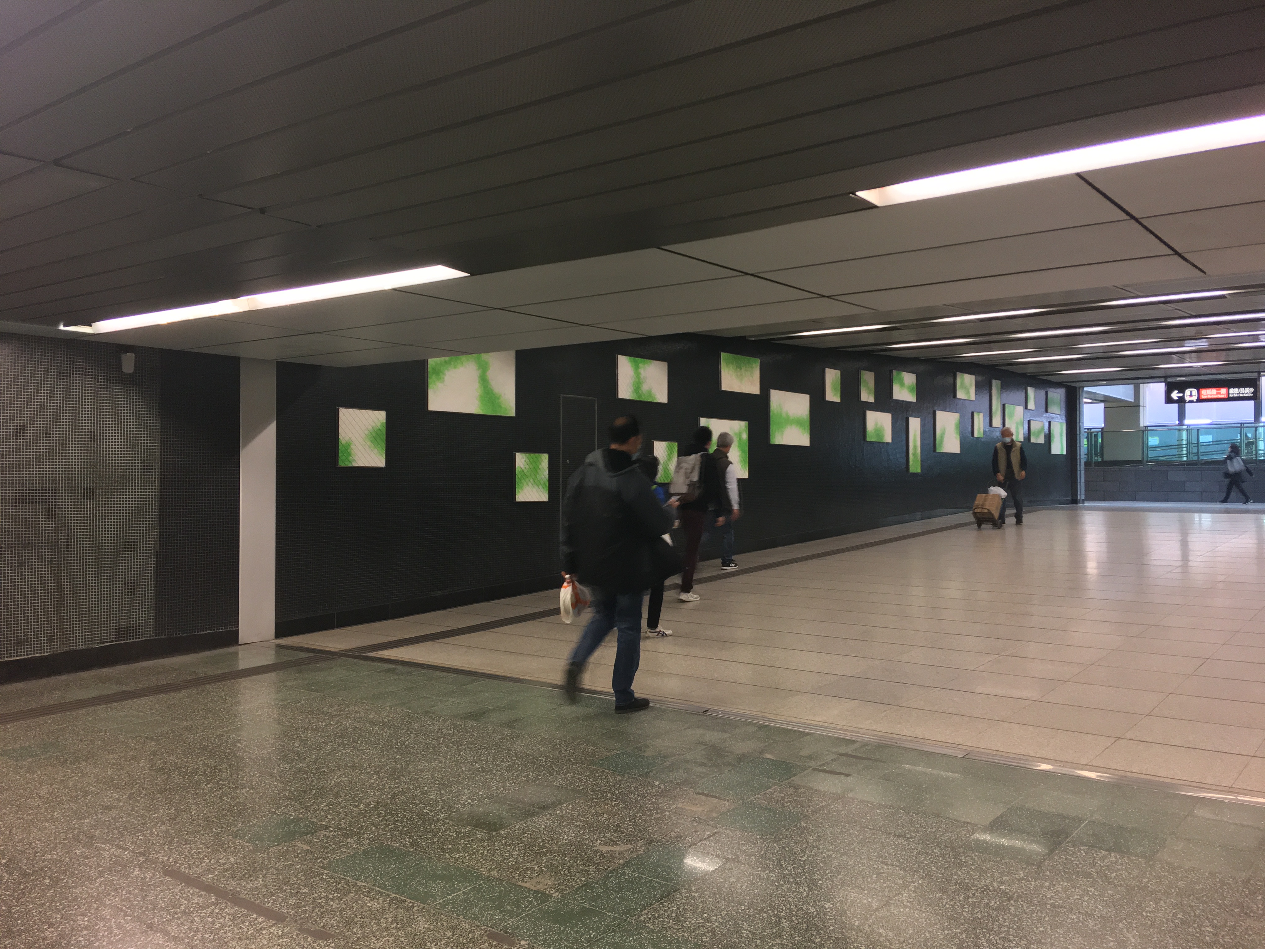Weโve already been to the Kwun Tong line platforms, so letโs see where the signs for the Tuen Ma line take us. The corridor widens as we begin sloping upwards, slowly but surely. Other transitions are a little more abrupt: the tiles on the wall start to flow seamlessly, the environs somehow brighter. I am old enough to remember when this end of the corridor was just a stub leading to a wide deserted exit, the unprepossessing words โTai Hom Villageโ being etched onto the faintly glowing board above the short staircase up. It would feel like the most mysterious place on earth: were there villages, here in the heart of the city? Were there people ploughing fields and wearing ridiculous sunhats? I never found out, and today that mystique no longer exists: the exit has been renamed the very familiar โSan Po Kongโ, and thousands flock through it as we walk past, looking for trains in two different colours. Ignoring the gaping maw of the streets, we turn the corridor, head down some steps, and suddenly we find ourselves in another concourse.