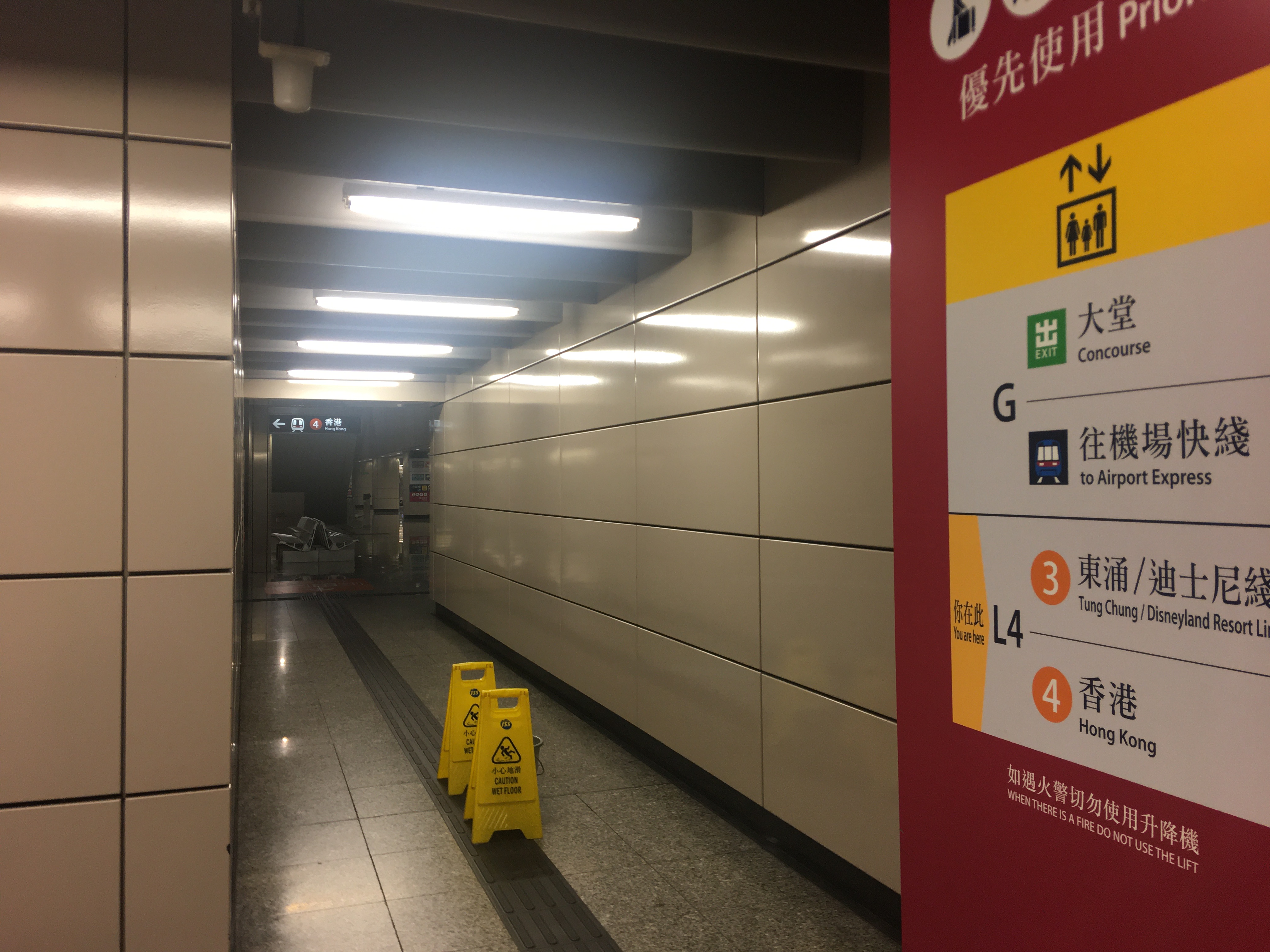 To be fair to the Airport, itโs got no shortage of interesting things to talk about. The way you can walk through the train to get between the two terminals, the contrast between glass and concrete that mirrors the style of the Tung Chung line, all of these make for a station of above-average calibre — but itโs not that interesting either. You can come here, and you can head into the adjacent building where they park the metal tubes that go in the air. That is all. This would make for a ridiculously short piece, and as we all know I am not a fan of short pieces. (Besides, there is an injunction in place at the Airport which prohibits your average nosy photographer from entering — as I found out to my cost.) Instead, then, let us trace the route of the Airport Express back into the city, in search of more oddities at the other end of the line.