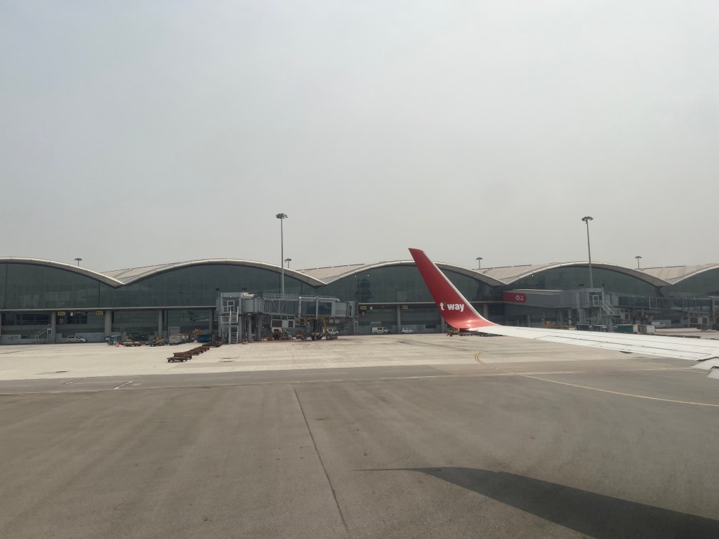 Luggage checked in and nervous bowels subsequently relieved, we head inside, where it’s a short walk and a ride on the people mover to the gate. The warmth of the late morning seems to have pervaded the terminal, and the air is uncomfortably warm as we lounge on the sofas, sipping from our water bottles and waiting for our flight to be announced. There seems to be a slight delay, and so we wait. The minutes tick by. The Sun blazes through the Plexiglas windows. Sunny and Eugene head over to the windows and peer down at the plane, which looks laughably small down on the tarmac. It feels impossible that that puny Boeing can take 20 passengers, let alone 200.