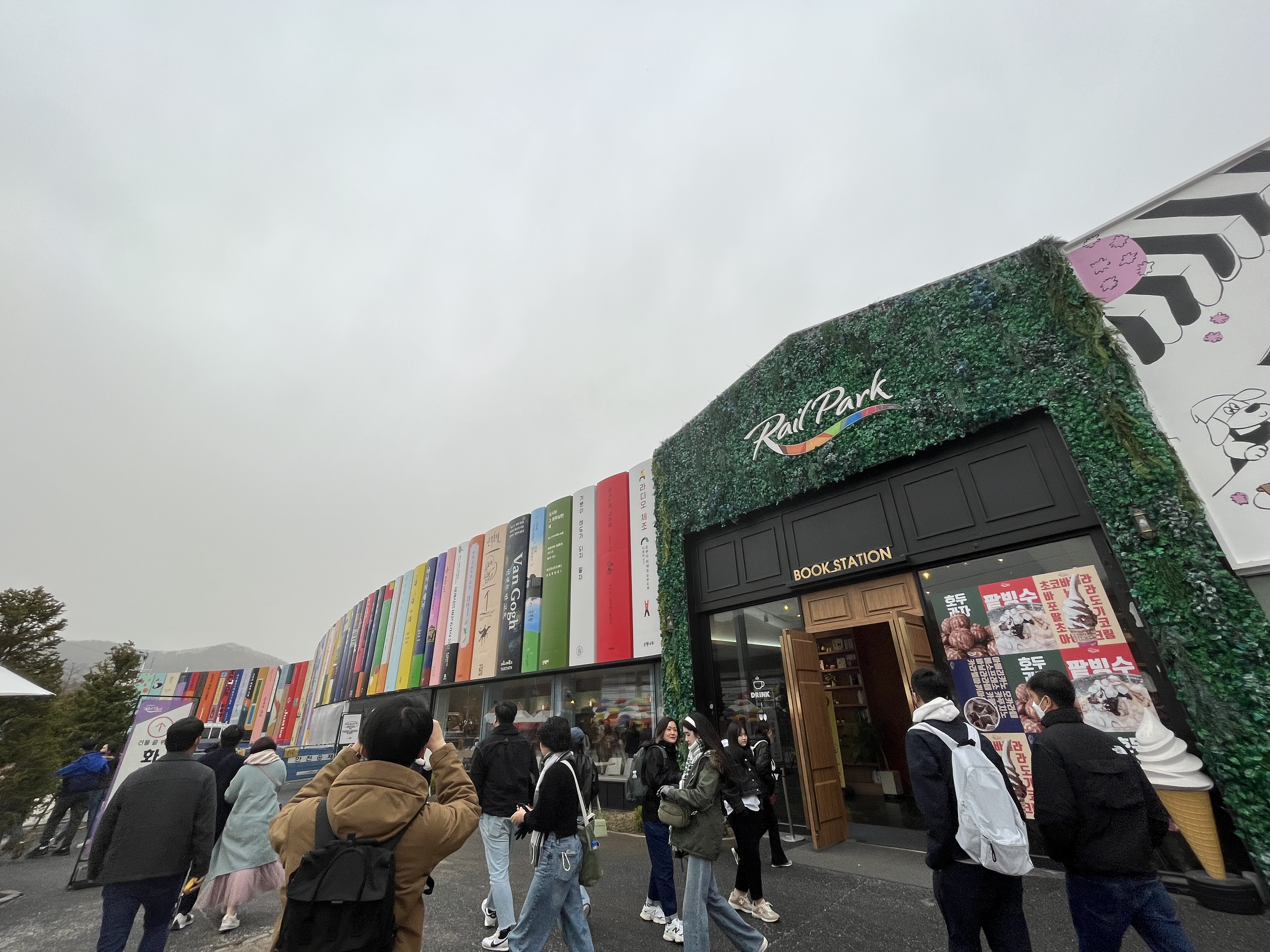 Some light drizzle begins falling as we disembark from the bus: heavy enough to be noticeable, yet light enough that none of us bother with opening our umbrellas. While everyone heads off to the toilet, we look around the starting zone. It’s classic tourist trap material: kitschy decorations strung from end to end, signposts in broken English, and a café so large it could almost be called a diner. Despite layers of down jackets and thermal undershirts the chill from the falling rain gets to me within about ten seconds, so after a few attempts at photos we all duck inside the café, where a booming business in coffee and croissants is being made, and where in amongst a library of fake cardboard books, I spot the title “Size Isn’t Everything” — a message rather undercut by the buxom lady prominently displayed on the cover.