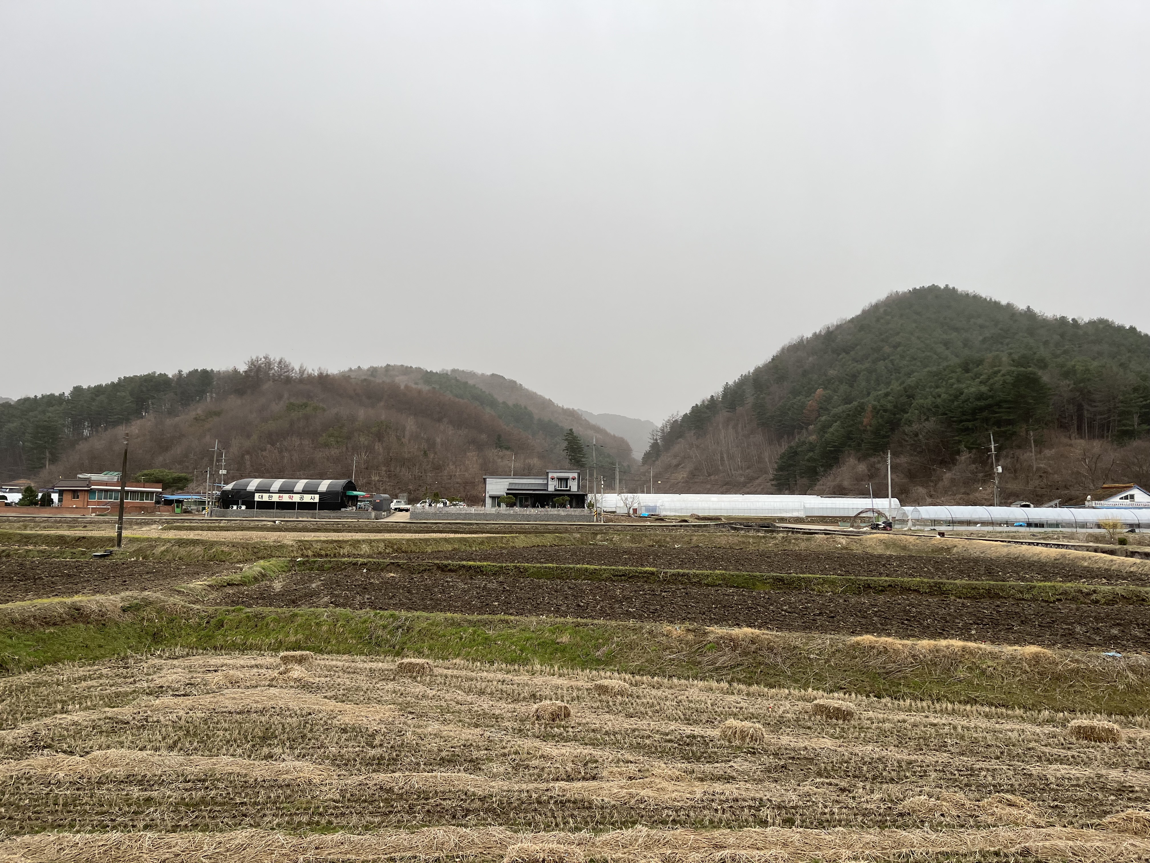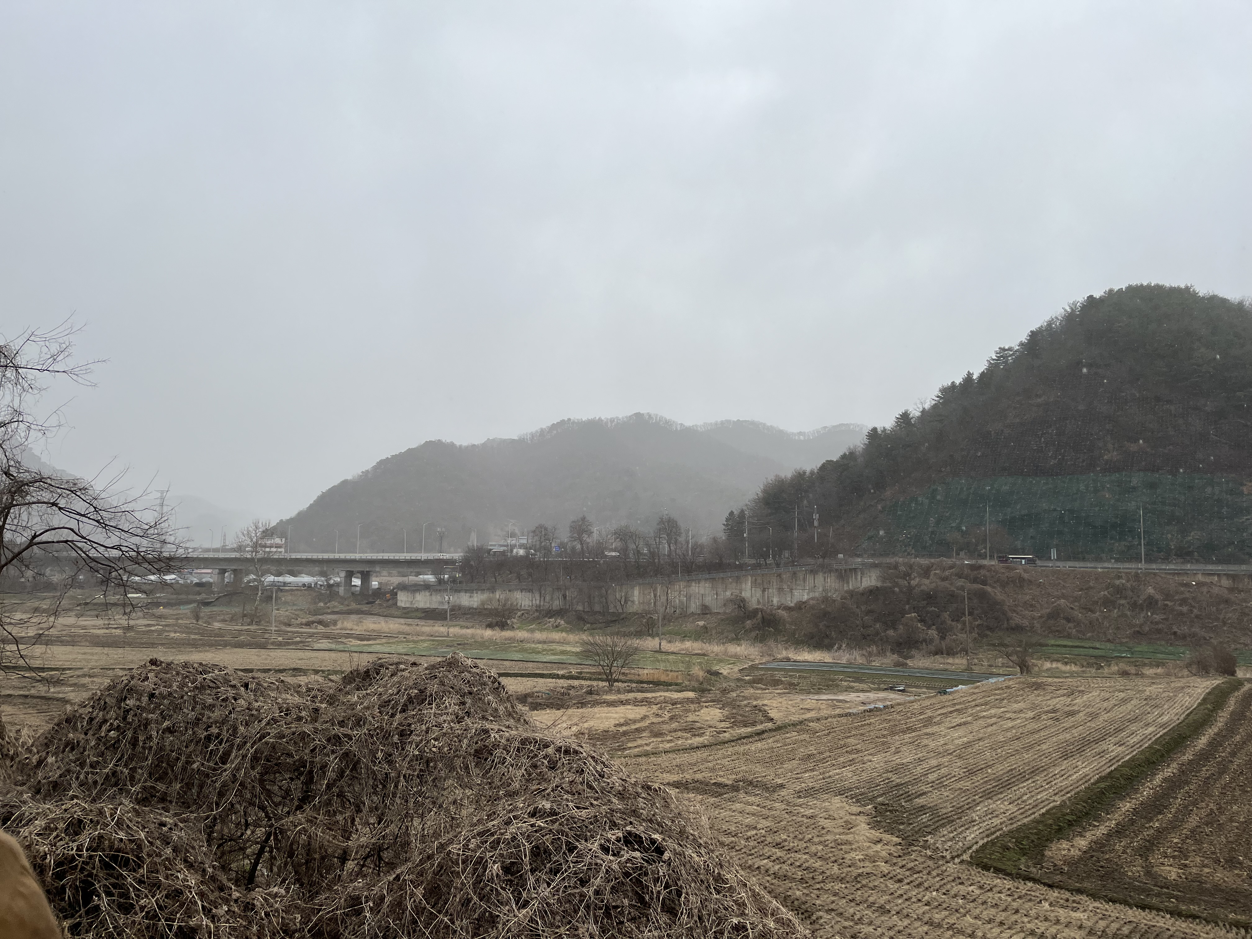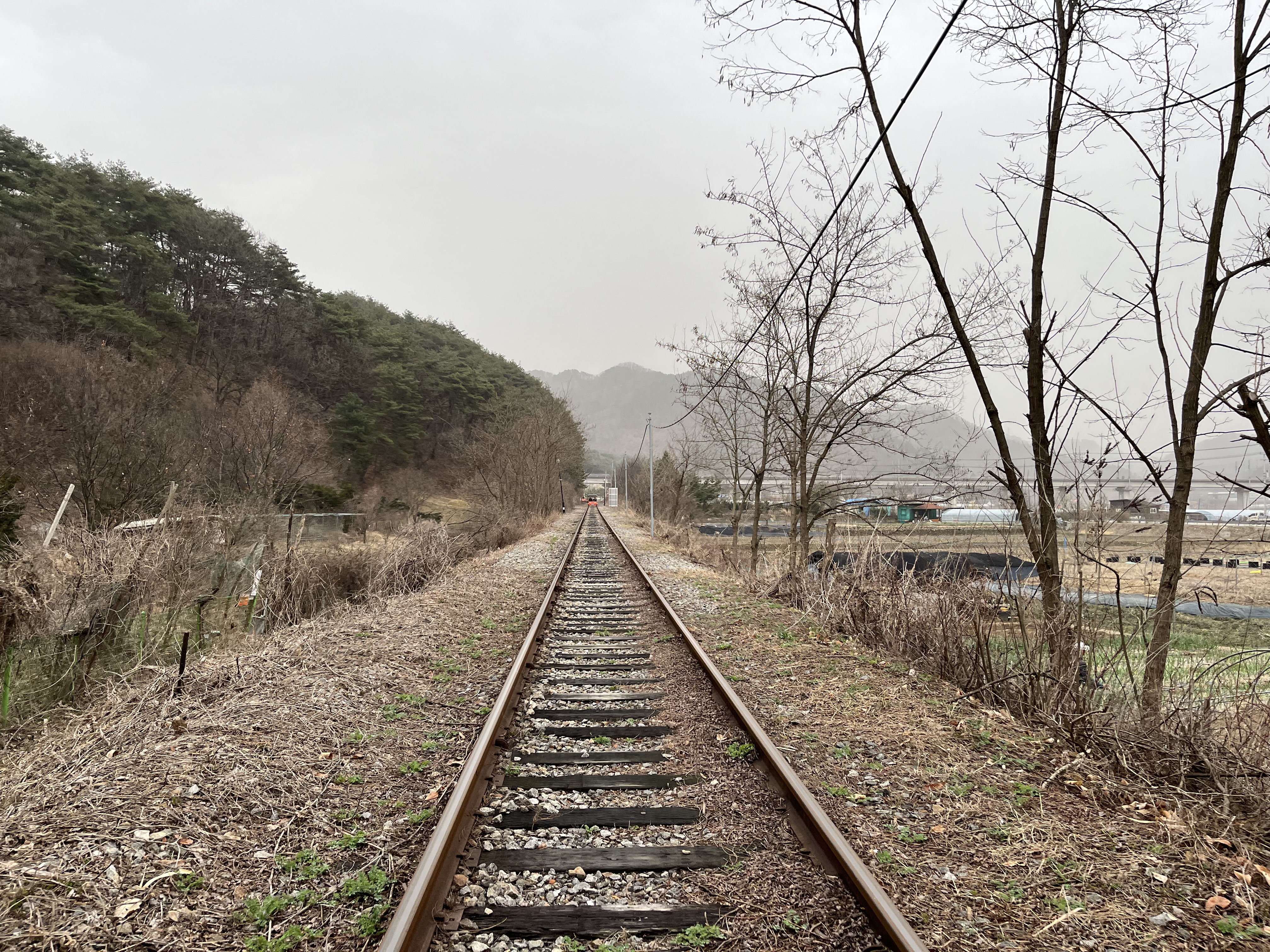 We pull off into a siding. Although there’s still some way to go before the old Gangchon station, we’re changing onto a train for the last third of our journey. Said train is currently nowhere to be seen, though, so while most of our fellow riders disappear into the wholly ineffective tent standing on the platform, others crowd around a kiosk selling fishcakes and sausages and other good things to eat when the temperature is five above freezing. Daniel and I head off to the outhouse at the far end of the station, which is little more than a wooden hut with a hole in the ground. When we emerge, the train is sitting at the platform and most of the visitors have disappeared, so the two of us rush up into the rear carriage seconds before it pulls out of the station. Apparently this part of the track was very popular with young lovers back in the 80s, to the point where a K-pop song was written about it — and that song is what floats through the carriage as we trundle along the tracks, the rain lashing against the windows. Can’t quite imagine how it was for all those kids way back then, but judging from the chatter in the carriage, a nice time on this cold, cramped and rather musty train is apparently possible.