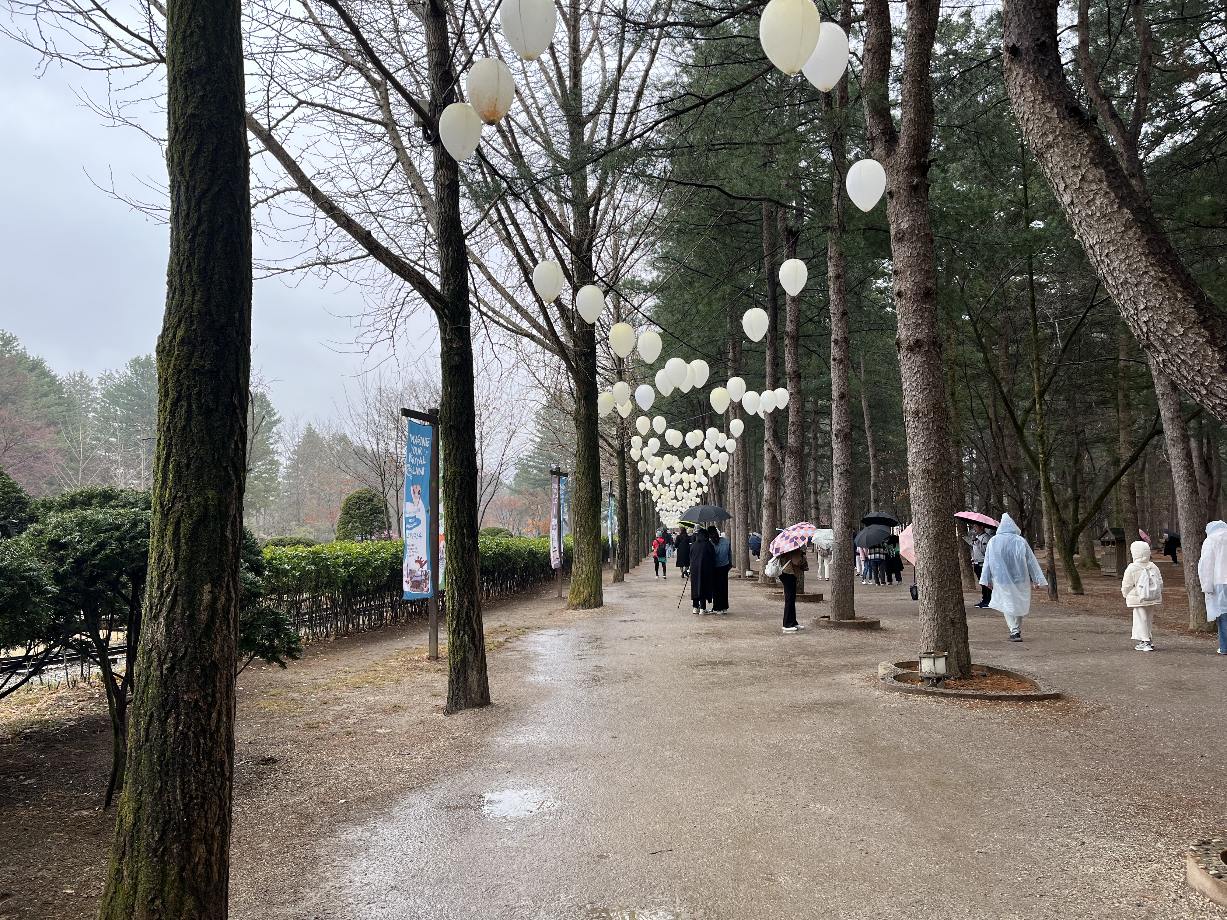 And yet after a while, after we’ve trudged through the mud, after we’ve taken a few freezing pictures for each other, the allure of the place begins to percolate through. Although the pines on the main path are bare from the cold of March, they still form a pretty sweet avenue on their own, and the balloon-shaped fairy lights hung from tree to tree are their own sort of charm — what must this place be like, when the sun is gone and your only way forward is illuminated by fiery, glowing balloons? From time to time we leave the main path, distracted by yet another side attraction: a miniature railway track, a bridge decorated with glass bottles, a garden with gargoyles and a stone fountain. The variety of shops here on the island also surprise the unsuspecting visitor: of course there are souvenir shops and the occasional snack kiosk, but one can also find libraries and woodworking kiosks and even a smithy (sadly closed when we were there, but still). And of course I can’t talk about this place without mentioning the animals: it is on Nami Island that I see a peacock in person for the first time in my life, while further on a couple of geese waddle across our path and over to a house of glass, which on closer inspection is a restaurant.