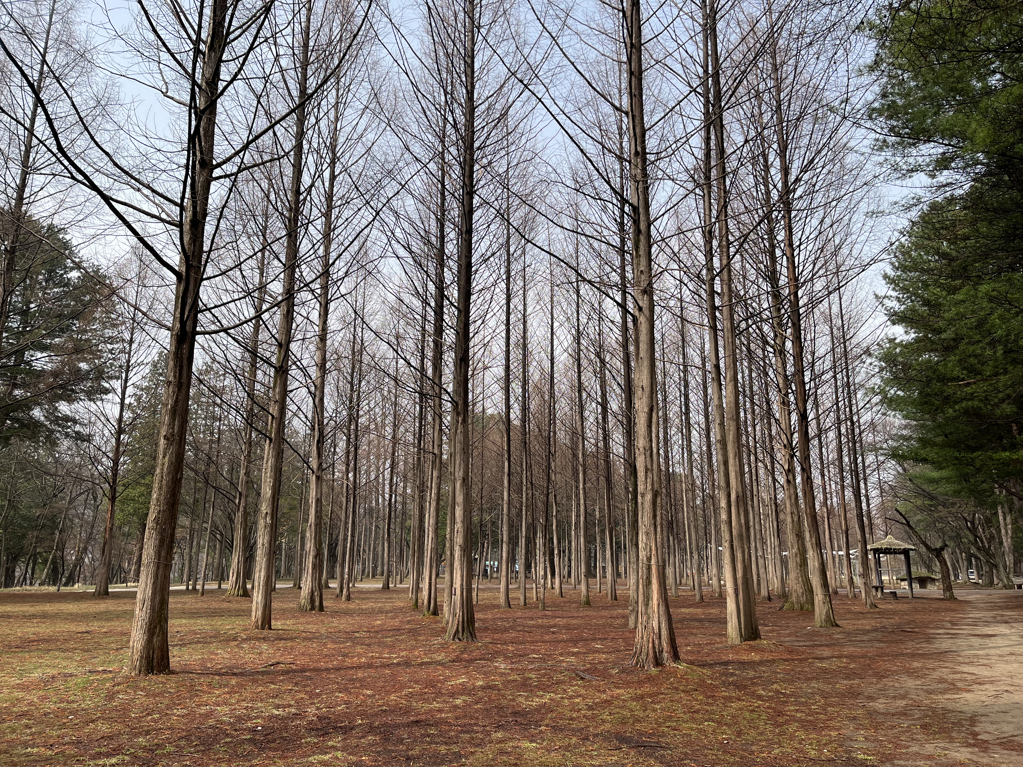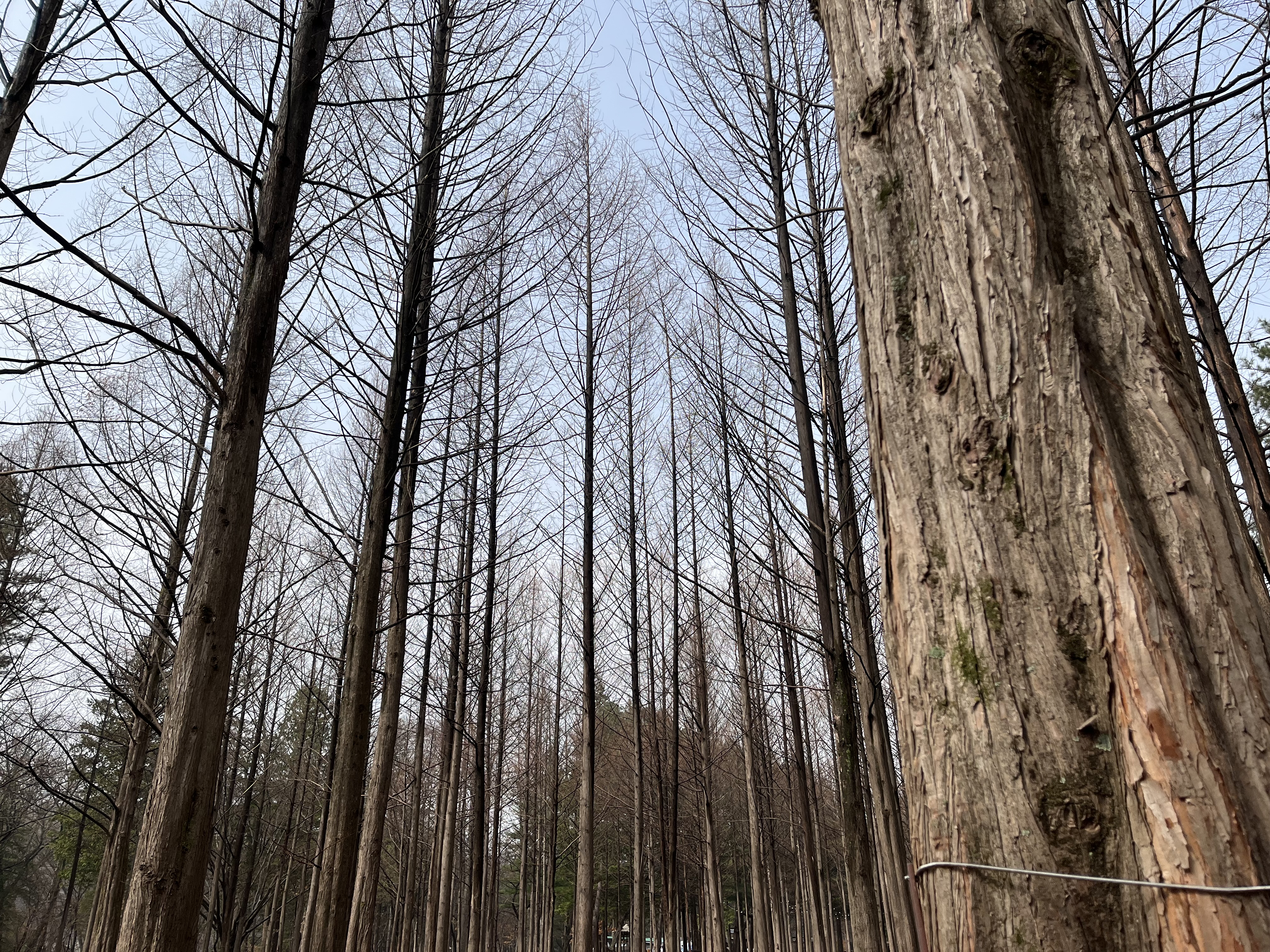 But the best part of the island has to be the part where we reach the other end of the island and see the avenue of gingko trees. Tree-lined avenues on the island are, as you’ve probably guessed by now, rather multifarious, but this one is in a league of its own: the trees stand ten metres, twenty metres, perhaps thirty metres into the air, their branches mesmerizingly bare. The wind blows gently through the gaps in the branches, making them shiver; underneath, hundreds of tourists crowd around the trees, anxious to take their picture in this eerily beautiful landscape. While this is all happening, ghostly carnival music floats through the air, as if we have somehow landed in another world entirely and South Korea was all just a dream. We snap our pictures there, in amongst the tree trunks, weaving on and off the paths laid before us. It all feels rather surreal, and despite all the tourists crowding round the island, I never feel more cut off from the real world than I am at Nami Island, wandering the island with its otherworldly, fantasy feel.