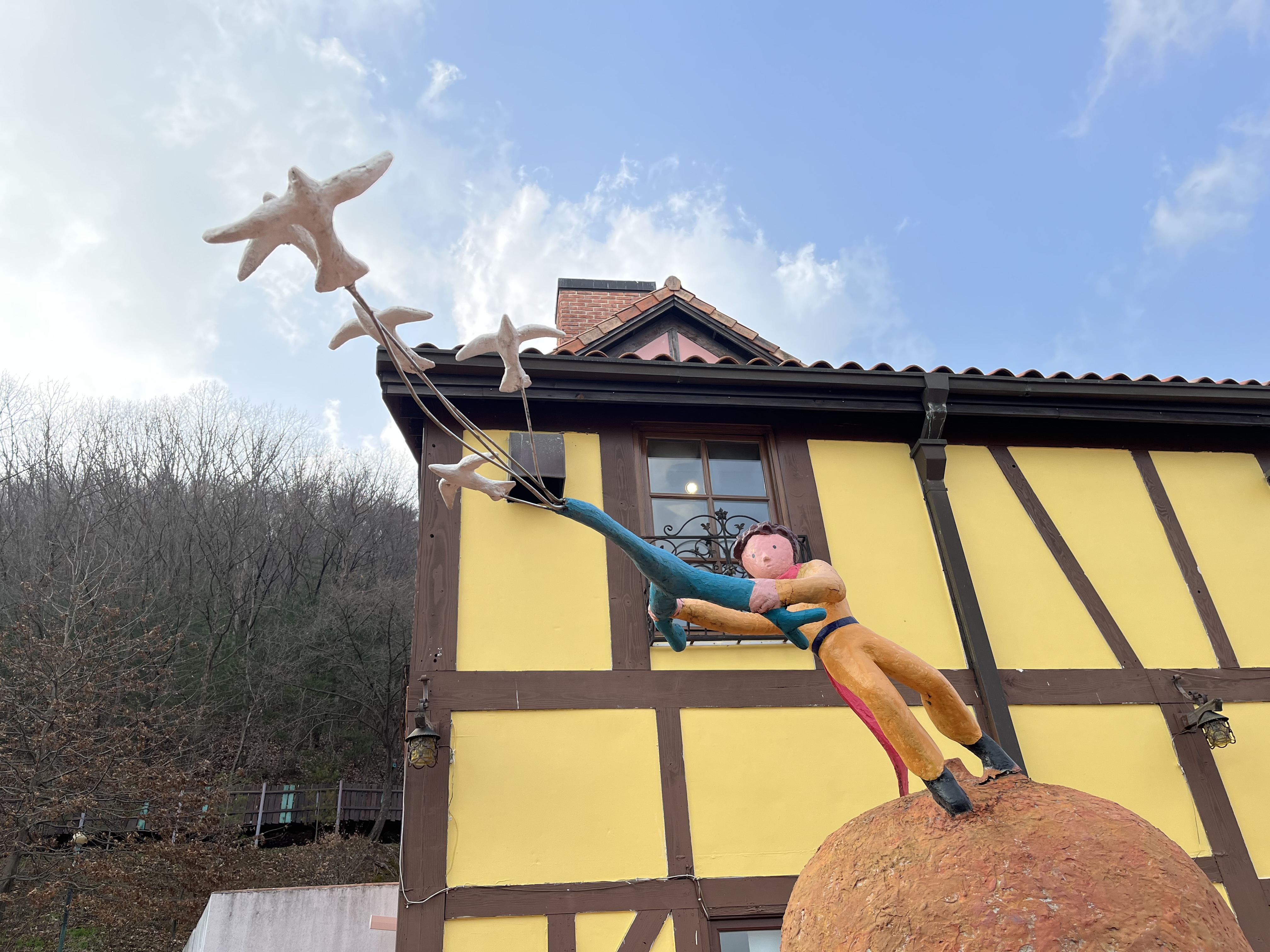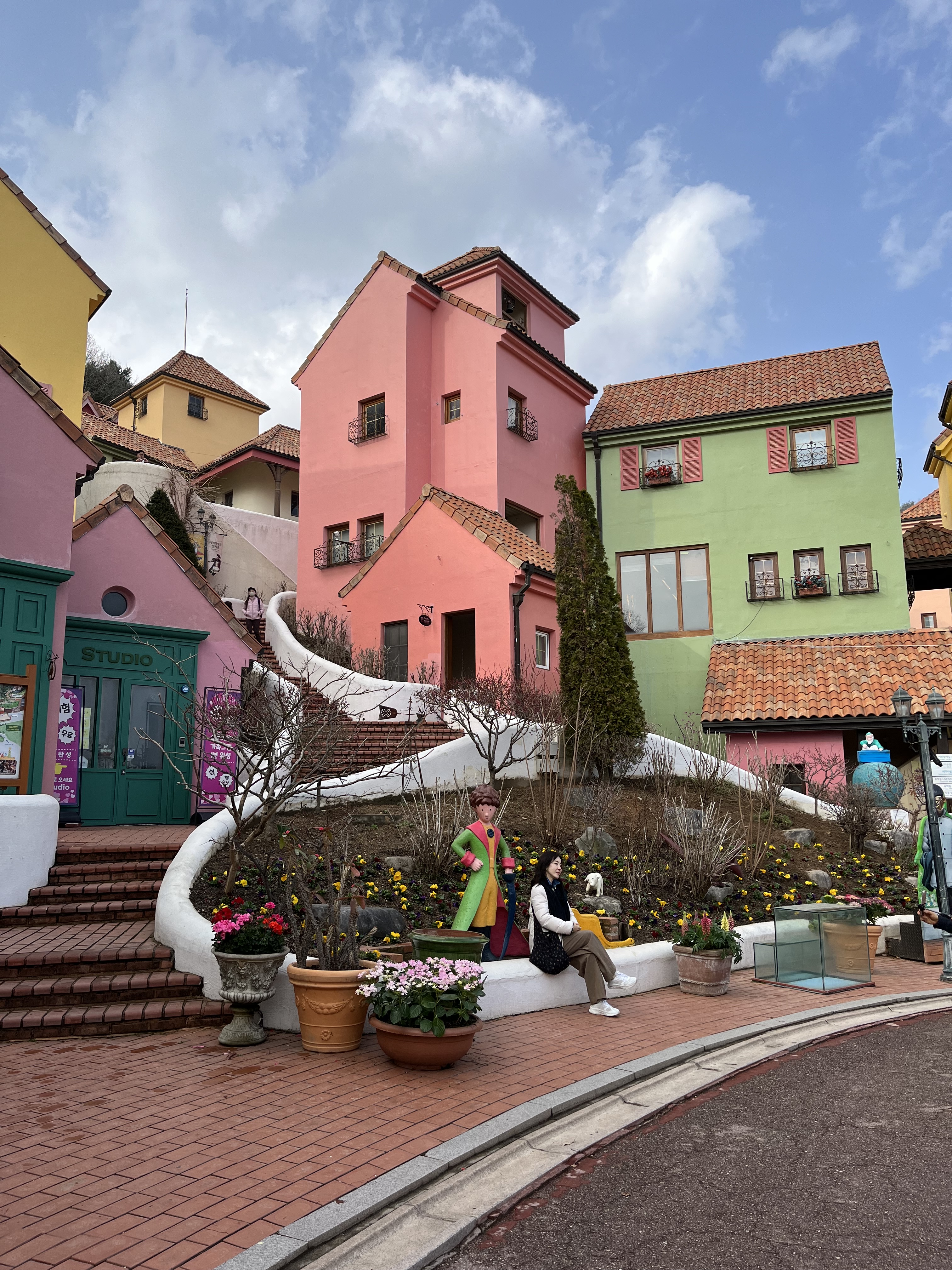 Three thirty. Despite all the sightseeing we’ve already done for the day, we’re far from finished. Just up the road from Nami Island is yet another tourist attraction — or to be precise, a pair of tourist attractions. As our bus arrives at the carpark, we can clearly see the twin settlements that dominate the hillside, along with a connecting path that diverges at the end of the parking lot and slopes toward the two. The one leading right heads up to a walled citadel, and as Coco has suggested we visit that first, we climb up the steep trail, huffing and puffing along the way. A gargantuan statue of Pinocchio abruptly looms out of nowhere, a ten-metre-tall colossus that simply towers over us and provides our brains with ample ammunition for nightmares tonight; this signals our arrival at the theme park known as Little Italy, the newer and more atmospheric of the two.