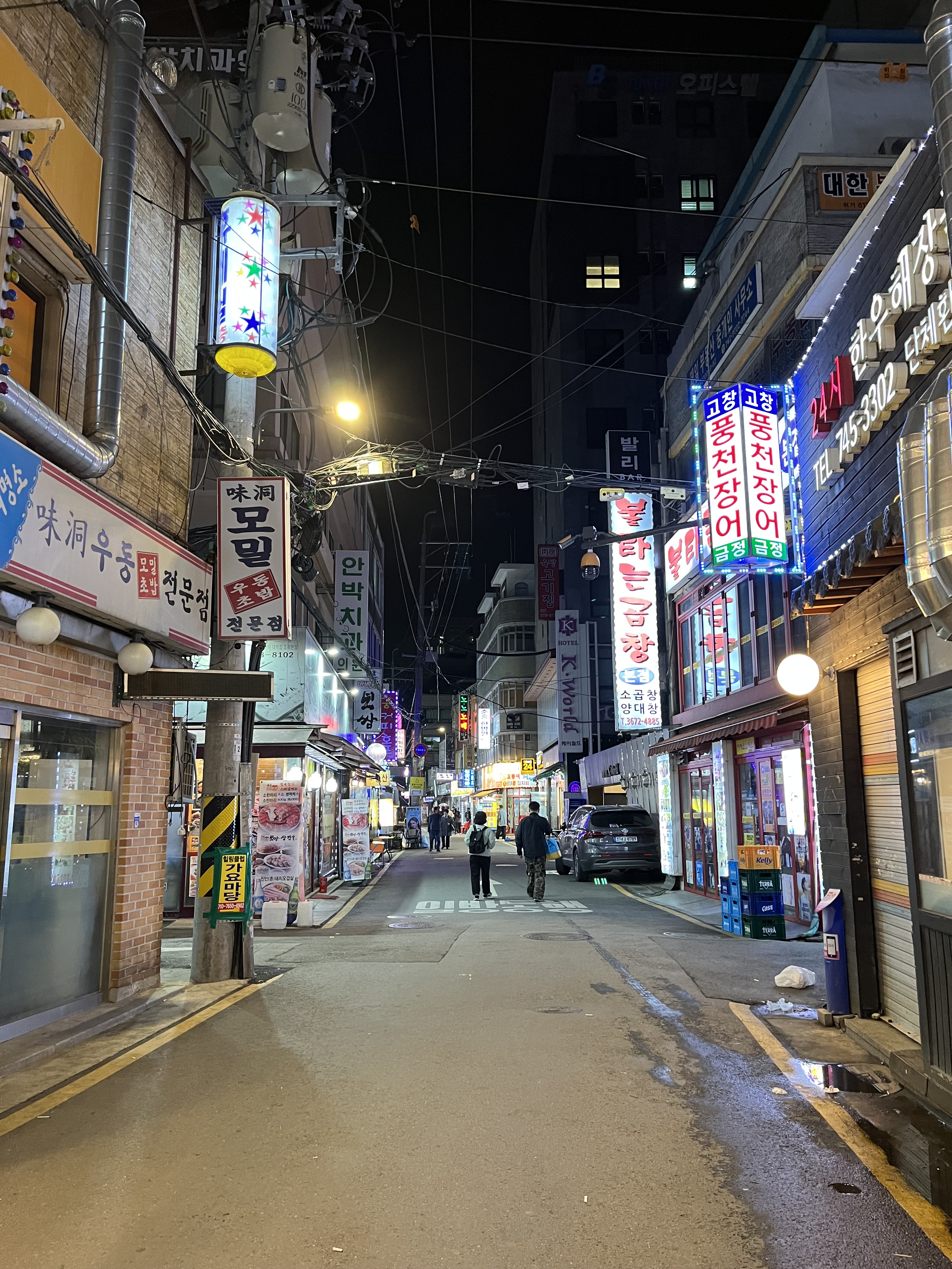 Finally, home time. We pass out of the theme park and back onto our bus; such is the amount of travelling we’ve done today that I fall asleep almost as soon as the bus pulls out of the parking lot. Awake to find the familiar interiors of tunnels passing by, our bus starting and stopping and starting again as we make our way through the dense spider’s web of rush-hour traffic. The sun dips, dims, and finally disappears as we trundle through Seoul’s northwestern suburbs, passing through some of the same districts we saw as we came into town three days ago — almost like a second reintroduction to the city. Eventually the streets narrow and the crowds on the pavement thicken, and before long we are grinding to a halt on an absolutely congested street corner, and my friends wake up to find the metropolis around them once more. This is Hongdae, the neighbourhood that surrounds the city’s Hongik University, and like most university quarters around the world it is a never-ending source of bustle and youthful energy; and it is here that we are being dropped-off. Job done, call it a day, head off back to the hotel…