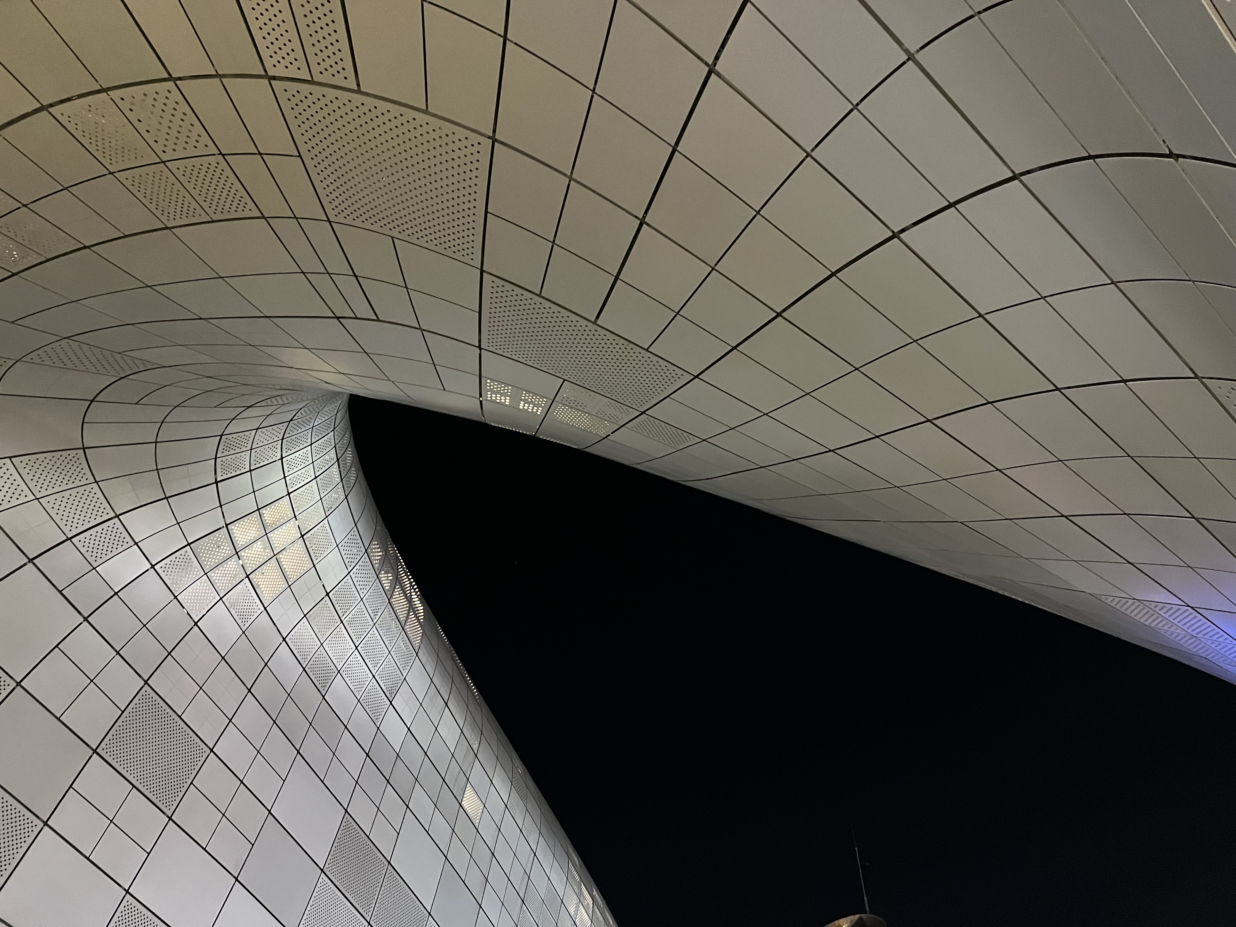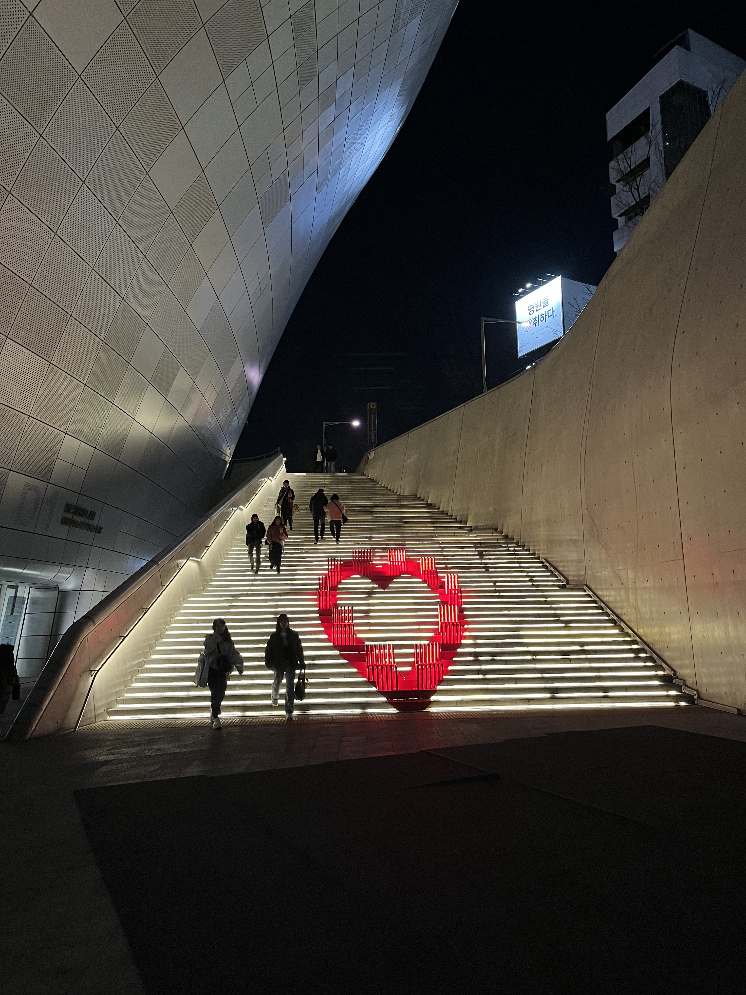 We move upwards to ground level, where the DDP has a complete change of character. Whereas it was all angular concrete underground, here it’s all smooth curves and metal, like an ever-evolving blob that might change form at any second. A slight shift of a few inches to the side is enough to produce a radically different picture: one moment I can still see the night sky, but one step to my right and most of my vision is occupied by the silvery building and the just-as-shapeless plastic chairs on the podium. Just around the corner, tucked within an arch in the building, a few youths climb and jump on the short, flat sculptures that line the passageway while blasting hip-hop music from their phones; it’s all very anarchic, like something out of A Hard Day’s Night, and yet it seems a perfect fit for its hypermodern surroundings, a testament to the never-ending energy that this place has to offer. And so it is that our day ends with the four of us standing there, gaping at this exuberant display of youth, mesmerised by Seoul’s never-ending capacity to surprise.